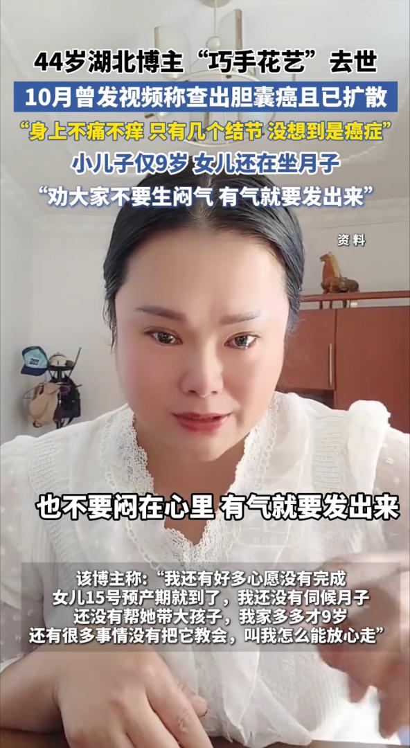 胆囊癌扩散了才发现, 从确诊到去世仅仅一个月, 自称是被气出来的,是生闷气生出来的。 11月18日凌晨,湖北一44岁女博主“巧手花艺”去世。就在一个月前,10月份的时候,她才发视频说已确诊胆囊癌且已扩散,没想到噩耗传来的如此之快。 她总结经验说,人不能生闷气,有气就要发出来。 那这个气到底是什么呢?是情绪,是想法,还是欲望? 想哭哭不出来,想笑笑不出来,算不算? 付出了却没有回报,算不算? 幻想家财万贯,算不算? 看来阎王要你三更死,谁敢留人到五更。