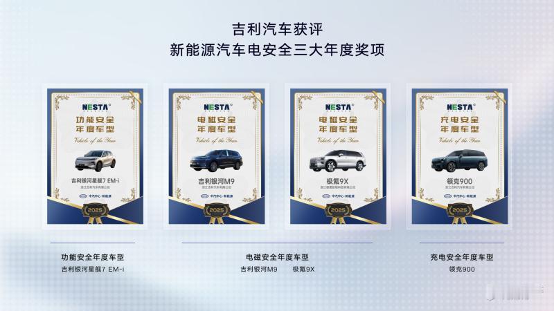吉利汽车在第三届新能源汽车电安全大会上,多款车型斩获大奖,安全认证拿到手软,专利数量更是中国品牌第一![666] 车型奖项: 吉利银河M9、极氪9X -> "电磁安全年度车型" 领克900 -> "充电安全年度车型" 吉利银河星舰7EM-i -> "功能安全年度车型" 安全体系: 行业首家完成新能源汽车安全管理体系建设 国内第一张六维电安全001号证书等多项"第一"认证 技术实力: 蝉联"动力电池安全预警算法大赛"特等奖 1562件安全技术专利 -> 中国品牌第一 吉利这波用实打实的奖项、认证和专利证明,它在电安全领域是真有料,不是花架子。这安全护城河算是挖得挺深了[强]。 那么问题来了,你选新能源车时,会把这些专业安全认证作为重要参考吗?还是更看重续航和智能配置?[吃瓜群众]