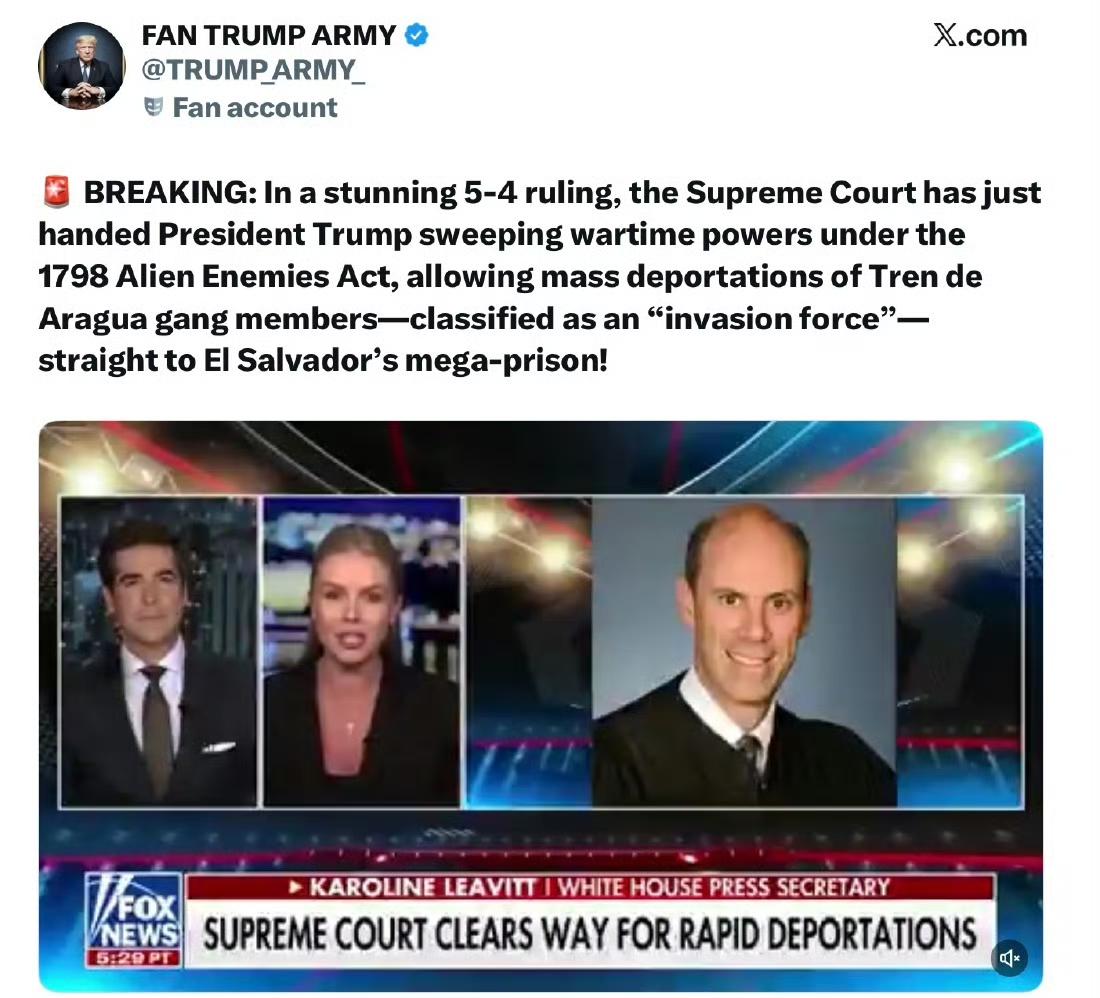 最高法院以5比4的裁决,依据1798年《敌国侨民法》赋予特朗普总统全面战时权力,允许将被列为"入侵部队"的阿拉瓜列车帮派成员大规模驱逐出境——直接遣送至萨尔瓦多超级监狱! 投下反对票的是三名自由派法官加"保守派"法官ACB。