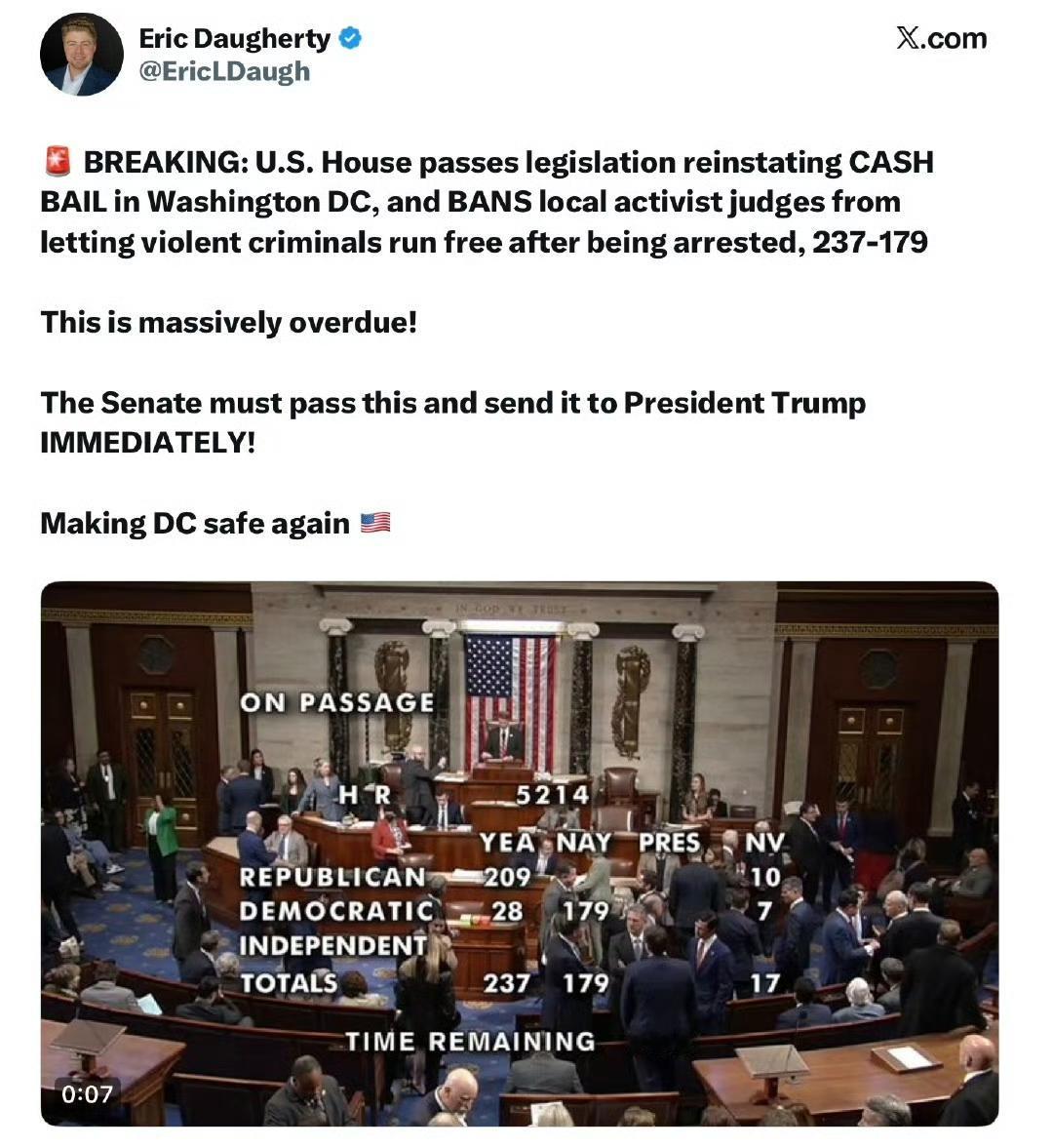 美众议院以237:179票通过法案,恢复华盛顿特区的现金保释制度,并禁止地方法官在暴力罪犯被捕后将其释放。 这项法案早就该通过了! 参议院必须立即通过并送交法案给特朗普总统!
