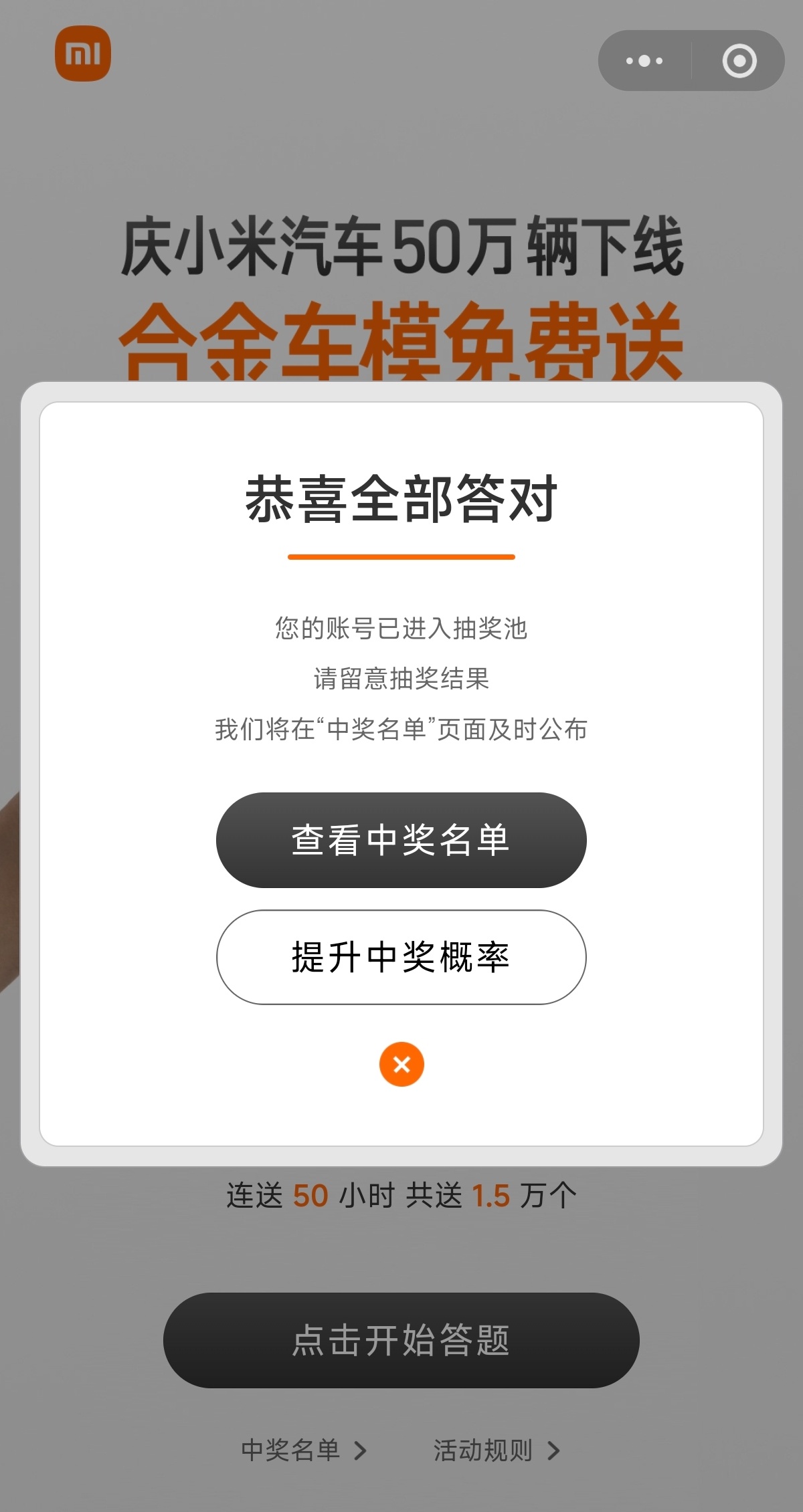 小米这次庆祝第50万台整车下线,特地送6万汽车模型。从明天开始的广州车展,每天送1000个,连送10天。从11月22日开始,小米汽车线下的活动门店,到店免费送,一共3.5万。还有一个是小米汽车公众号答题,每小时送300个,送50小时。题目非常简单,千万不要错过。