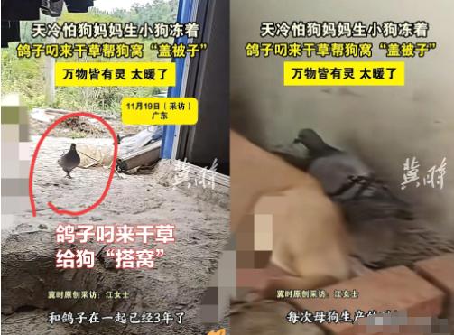 万万没有想到,广东一网友发视频分享,自己狗子下狗崽后,这家中养的一只鸽子,竟忙前忙后的为狗子和狗崽们叼草坝窝。视频可见,狗妈和狗崽躺在窝里时,这鸽子则叼着一根根草木给它们垫在窝里,虽然鸽子跑进跑出的叼草木显得非常忙碌,但可以感受到,鸽子为了狗子们垫窝也是不辞辛苦。而这一幕被发到网上后,更是引起了网友们的一片热议。 广东一户普通人家的院子里,最近出了件让人越看越暖心的稀罕事,家里的狗狗刚生下一窝毛茸茸的幼崽,还没等主人多忙活,一只家养的鸽子竟主动凑了上来,把照顾狗崽的“后勤活”揽了大半,活成了全家公认的“编外月嫂”。 谁都知道鸽子天生带翅膀,飞起来又快又稳,可这只小家伙像是忘了自己的“飞行技能”,一忙起来就全程保持小跑状态,在院子里来来回回穿梭,那着急忙慌的劲头,活脱脱像个赶项目 的打工人。 它的核心任务是给狗窝找垫窝的材料,为了挑到合适的草梗和小树枝,这鸽子也是拼了,撅着圆滚滚的屁股在草丛里扒来扒去,眼睛瞪得溜圆,一旦看中目标就立刻叼在嘴里,然后迈着小短腿飞快地往狗窝跑,全程脚不沾地,那一本正经的模样,让人忍不住笑:这鸽子怕不是忘了自己会飞,反倒把“跑腿”技能点满了。 更有意思的是狗妈的反应。按说母狗护崽心重,要是陌生的飞禽靠近,早就龇牙咧嘴警惕起来了,可面对这只跑来跑去的鸽子,狗妈却淡定得很,乖乖躺在窝里喂奶,任由鸽子在身边忙前忙后,时而叼着草梗往窝里铺,时而在旁边踱来踱去“巡视”,那股子无需言说的默契,看得人心里暖暖的。 显然,狗妈早就把这只跨界帮忙的鸽子当成了自己人。 这事被发到网上后,网友们都乐坏了,调侃的同时满是感动。有人说这鸽子是“金牌月嫂”实锤了,不用飞的,光凭这撅屁股找草、跑断腿忙活的服务态度,就得给五星好评;还有人打趣,等狗崽们长大了,跟别的小狗吹牛都有资本了:“我不光有亲妈,还有个会飞的‘鸽子姑妈’呢!” 大家都管这只鸽子叫“咕妈”,它没什么复杂的心思,就是单纯地想帮忙,用实际行动证明了“有事它真上”。 虽然物种不同,连语言都不通,但这份纯粹的善意却没被阻隔。现在看着院子里的画面:狗妈温柔地舔着幼崽,鸽子在一旁叼来新的草梗,阳光洒在它们身上,别提多治愈了。 其实仔细想想,这哪里是动物的灵性那么简单,分明是万物之间最本真的善意在流动。 没有算计,没有所求,只是看到对方需要帮忙,就自然而然地伸出援手。这种不掺杂任何杂质的双向接纳,比人类世界里复杂的人情往来更让人觉得通透。不得不说,这户人家院子里的跨物种友谊,真是把“爱不分边界”这句话诠释得明明白白,看一眼都觉得心里暖暖的,治愈了不少生活里的琐碎烦恼。 信息来源:冀时