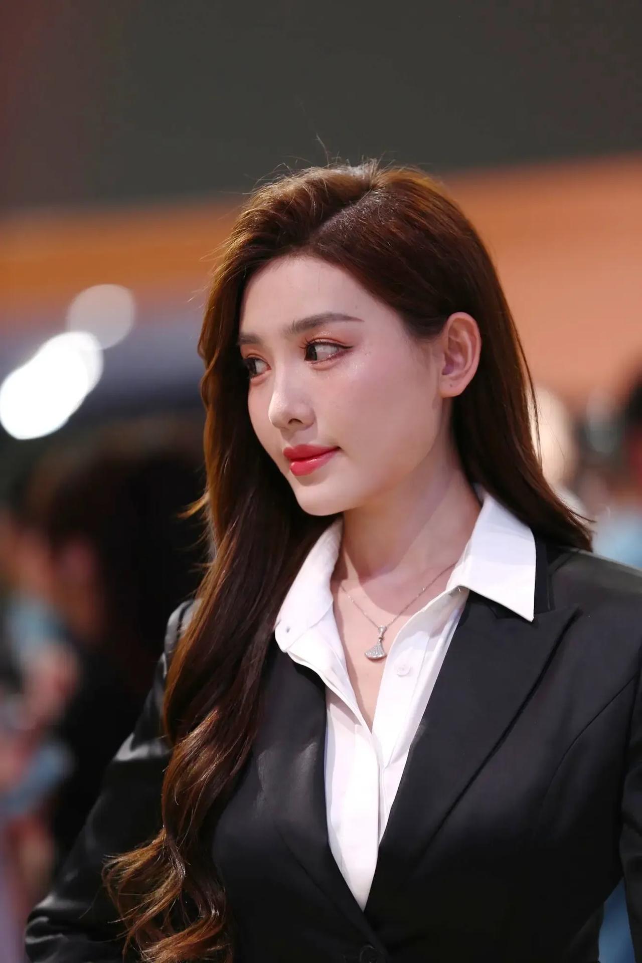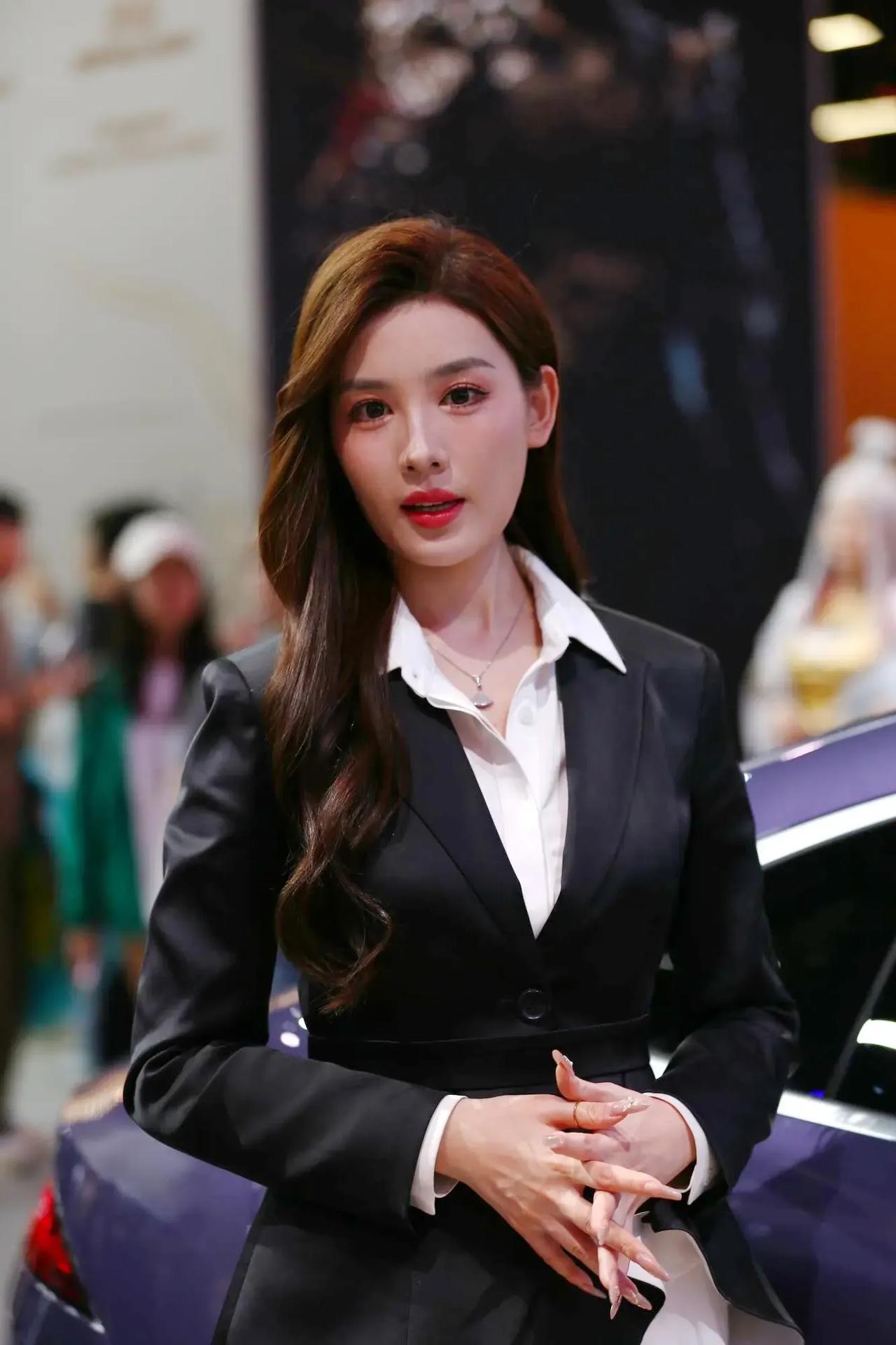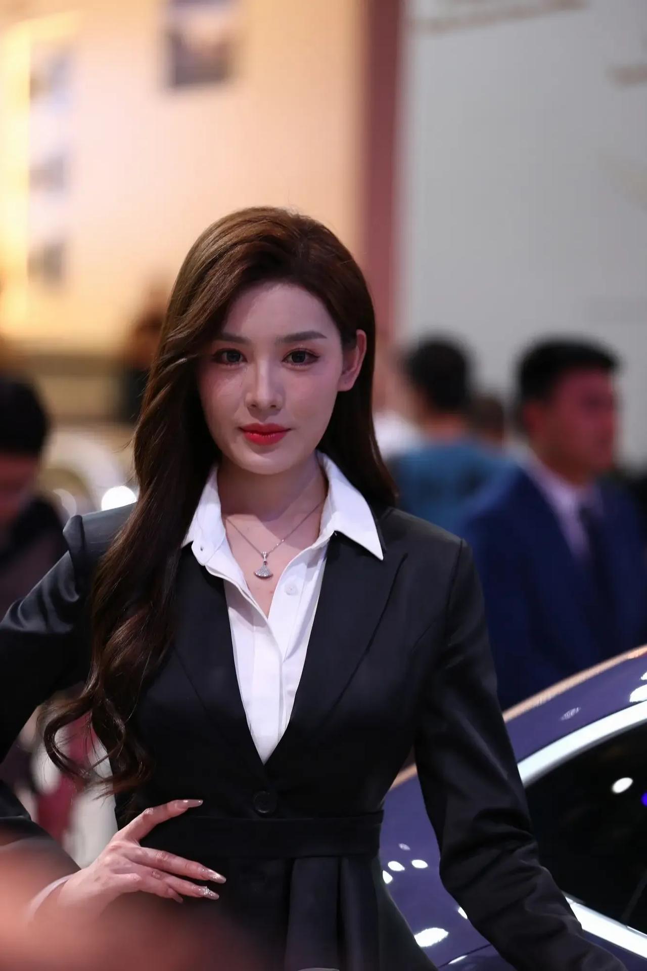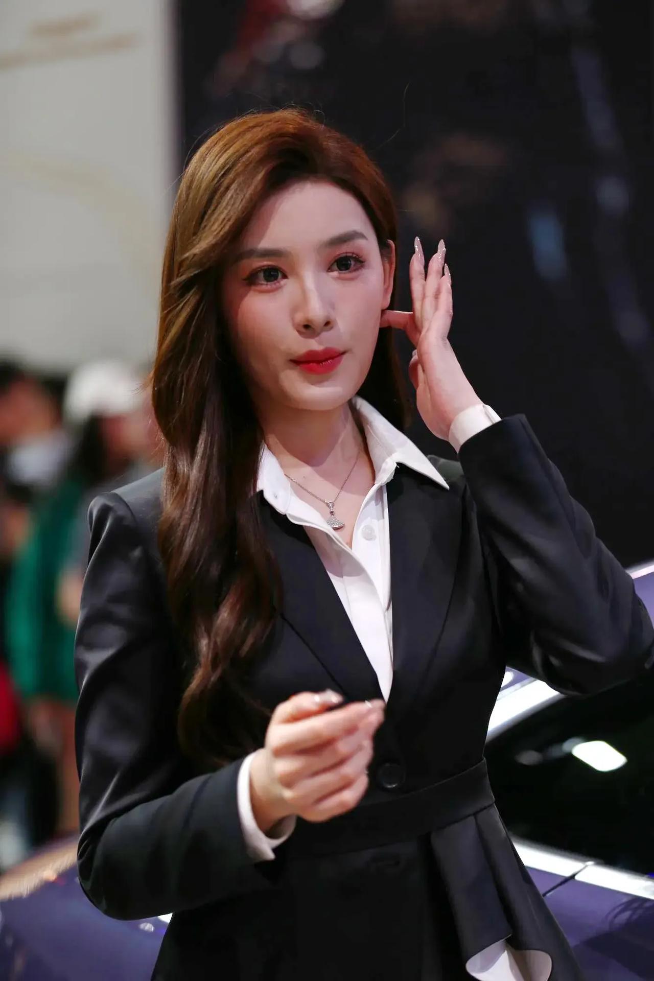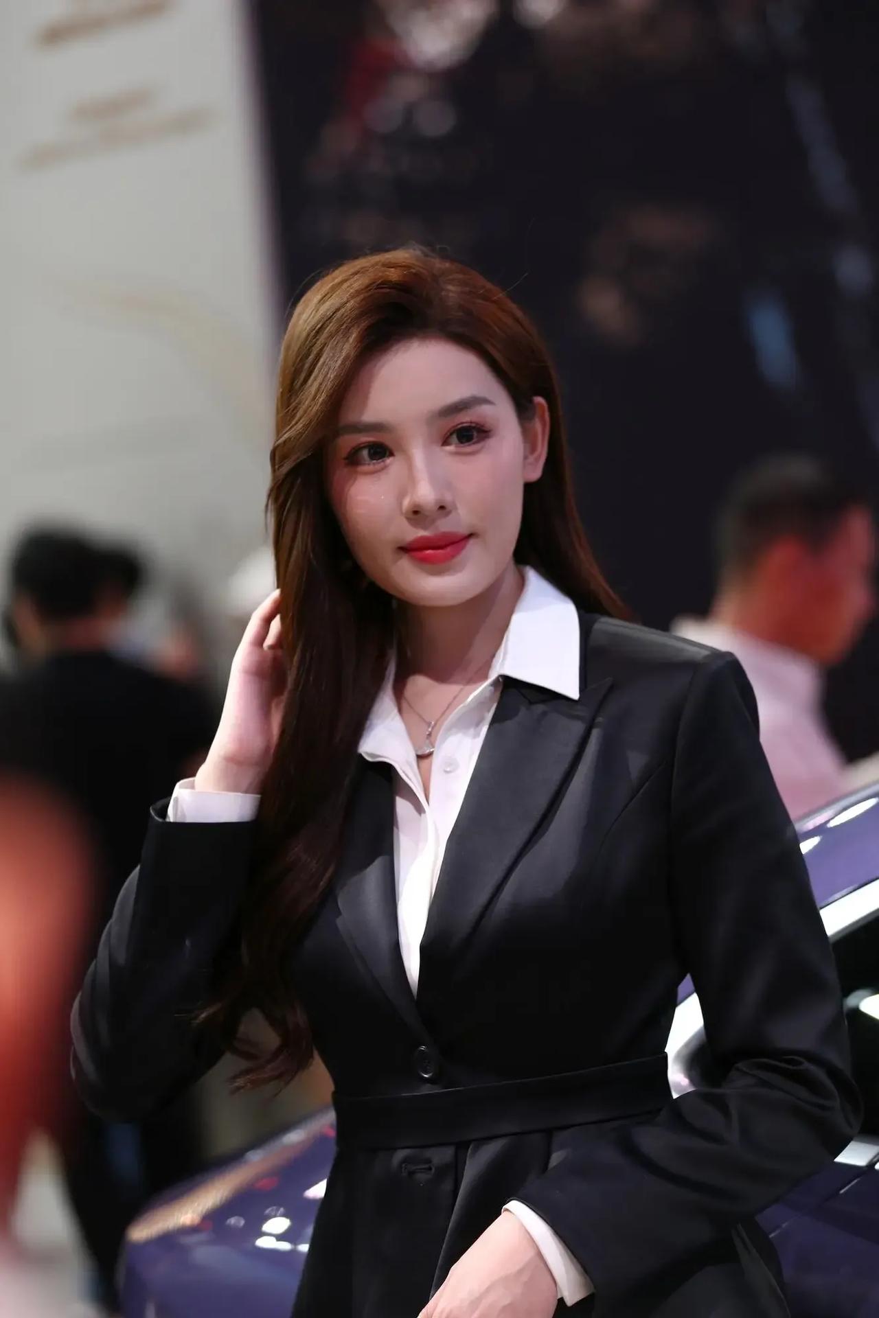 车展上,高颜值靓丽车模珍妮搭配浅蓝色西装。