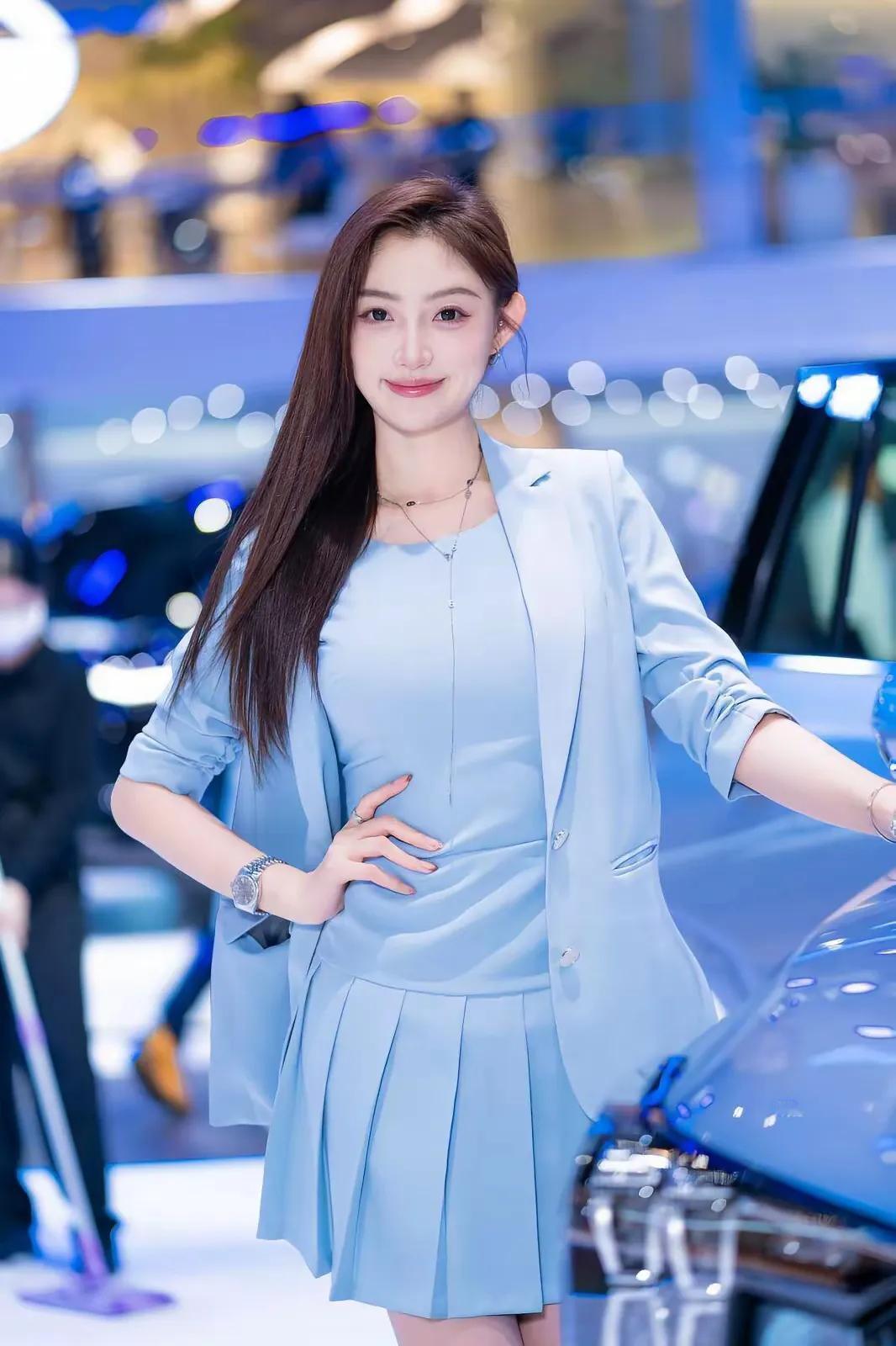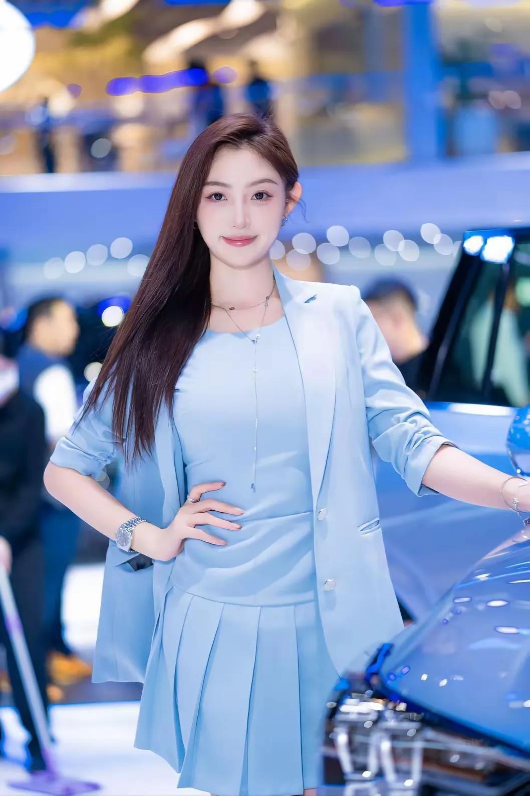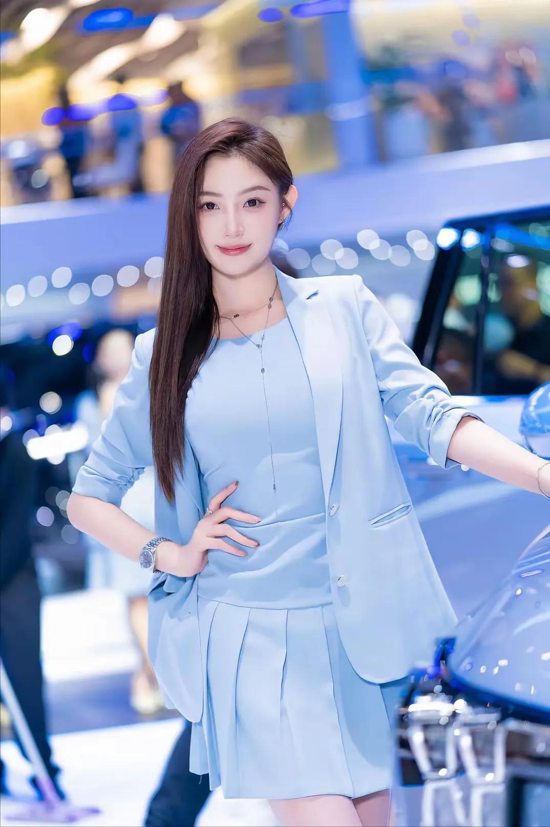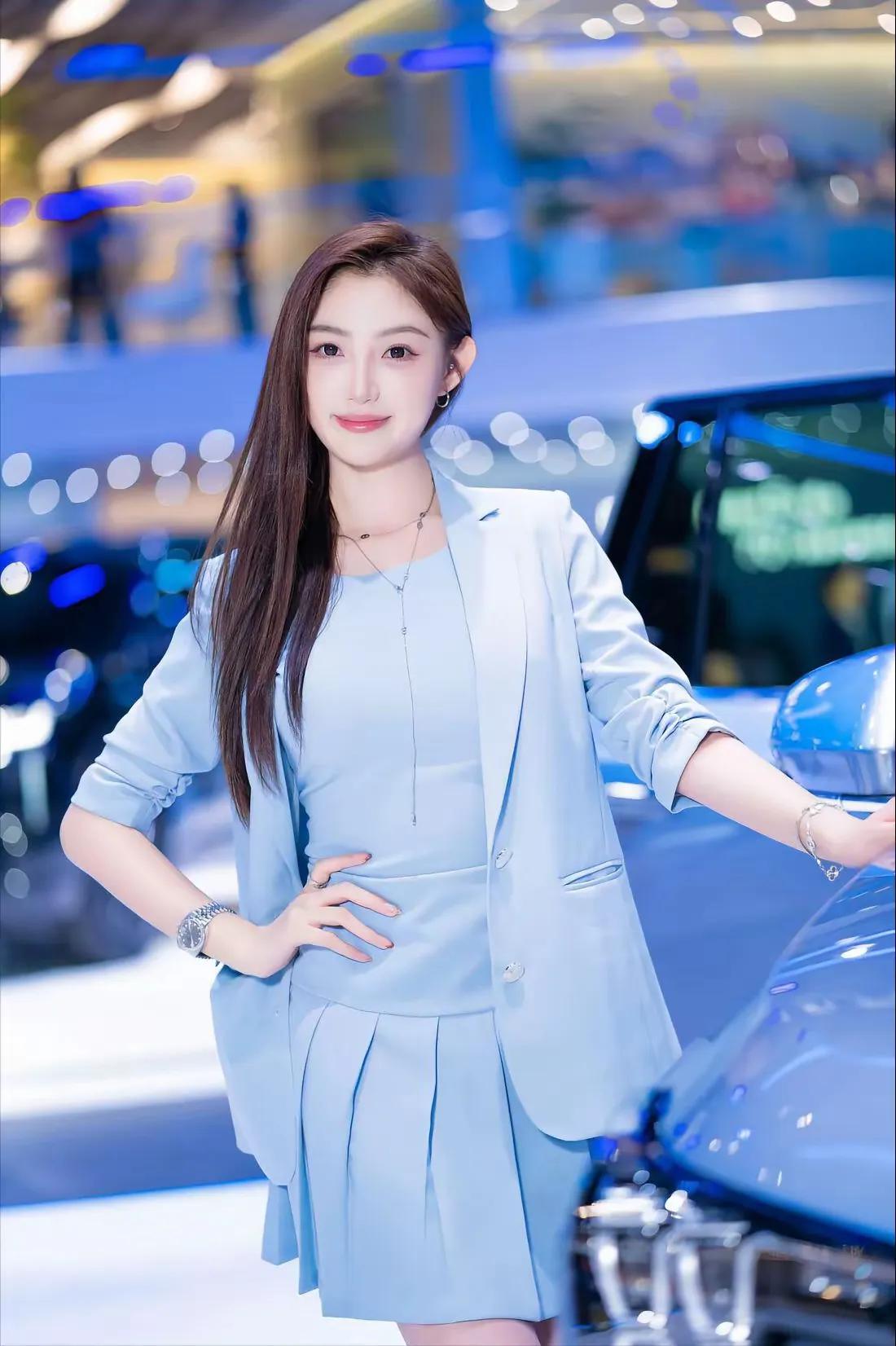 车展上,高颜值靓丽车模珍妮搭配浅蓝色西装。