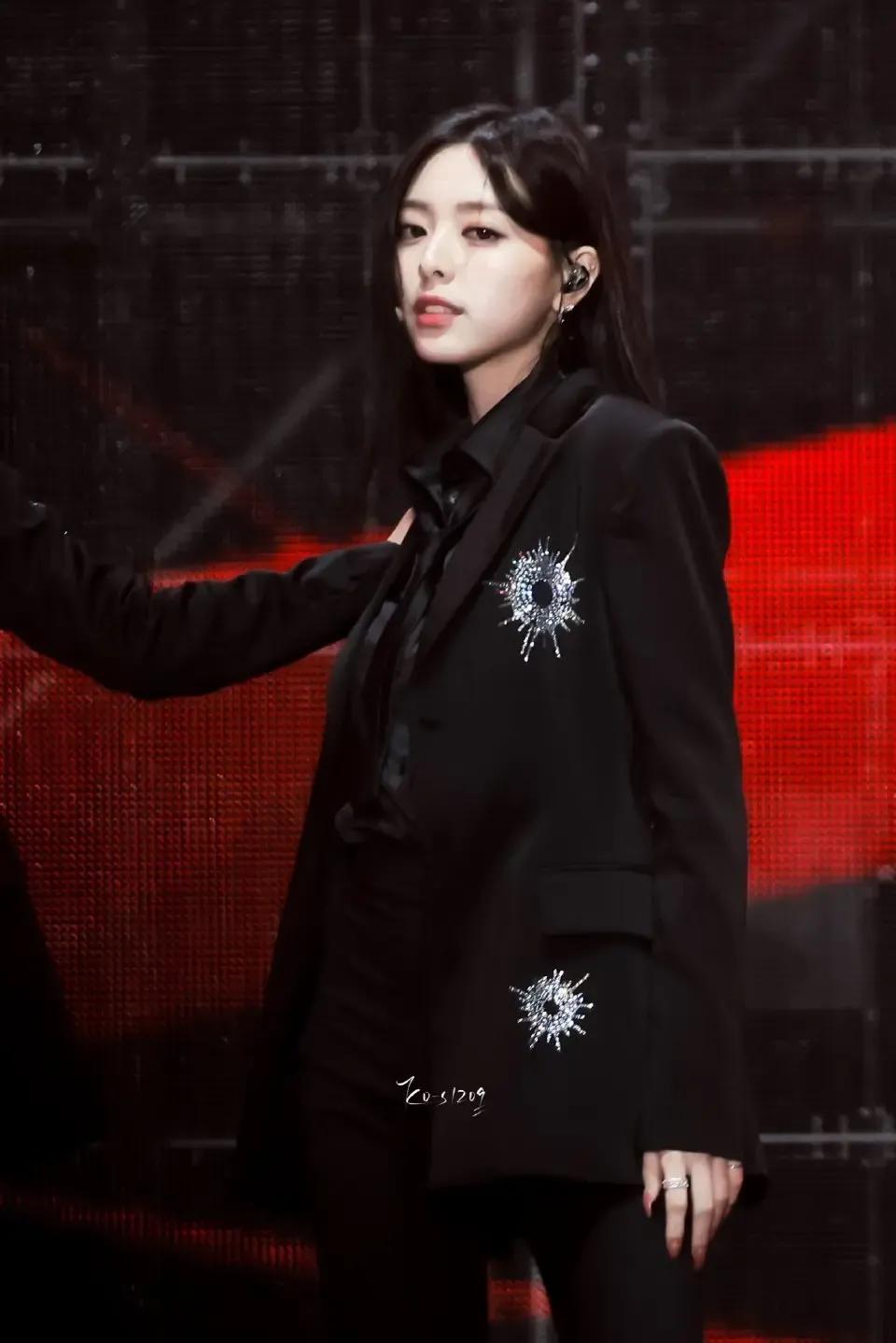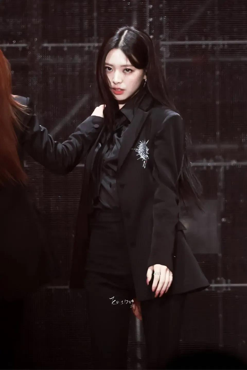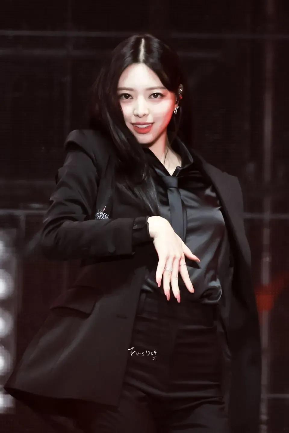 申有娜黑色西装搭配黑色衬衫,尽显时尚魅力。