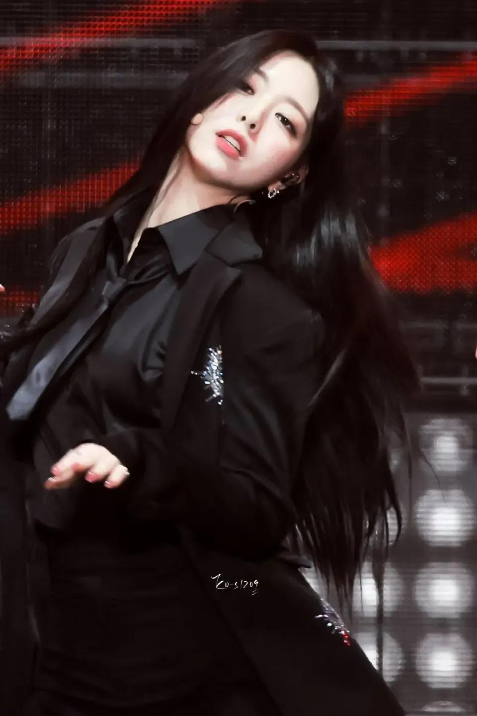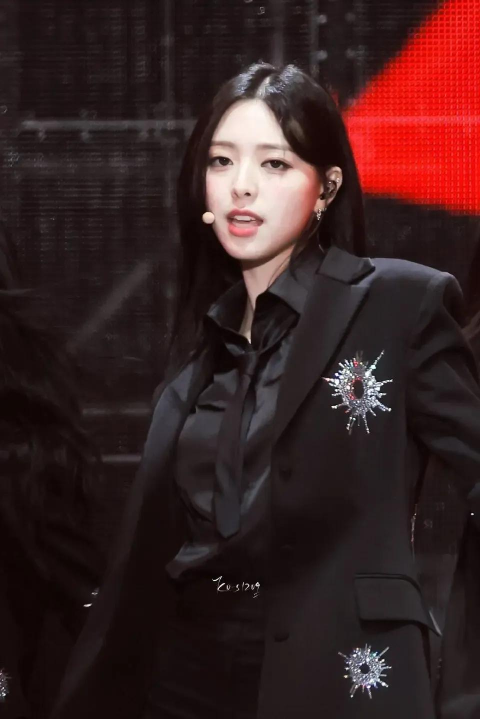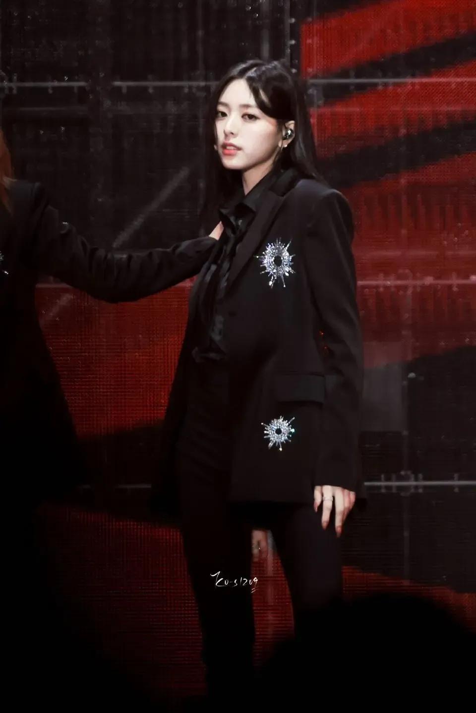 申有娜黑色西装搭配黑色衬衫,尽显时尚魅力。