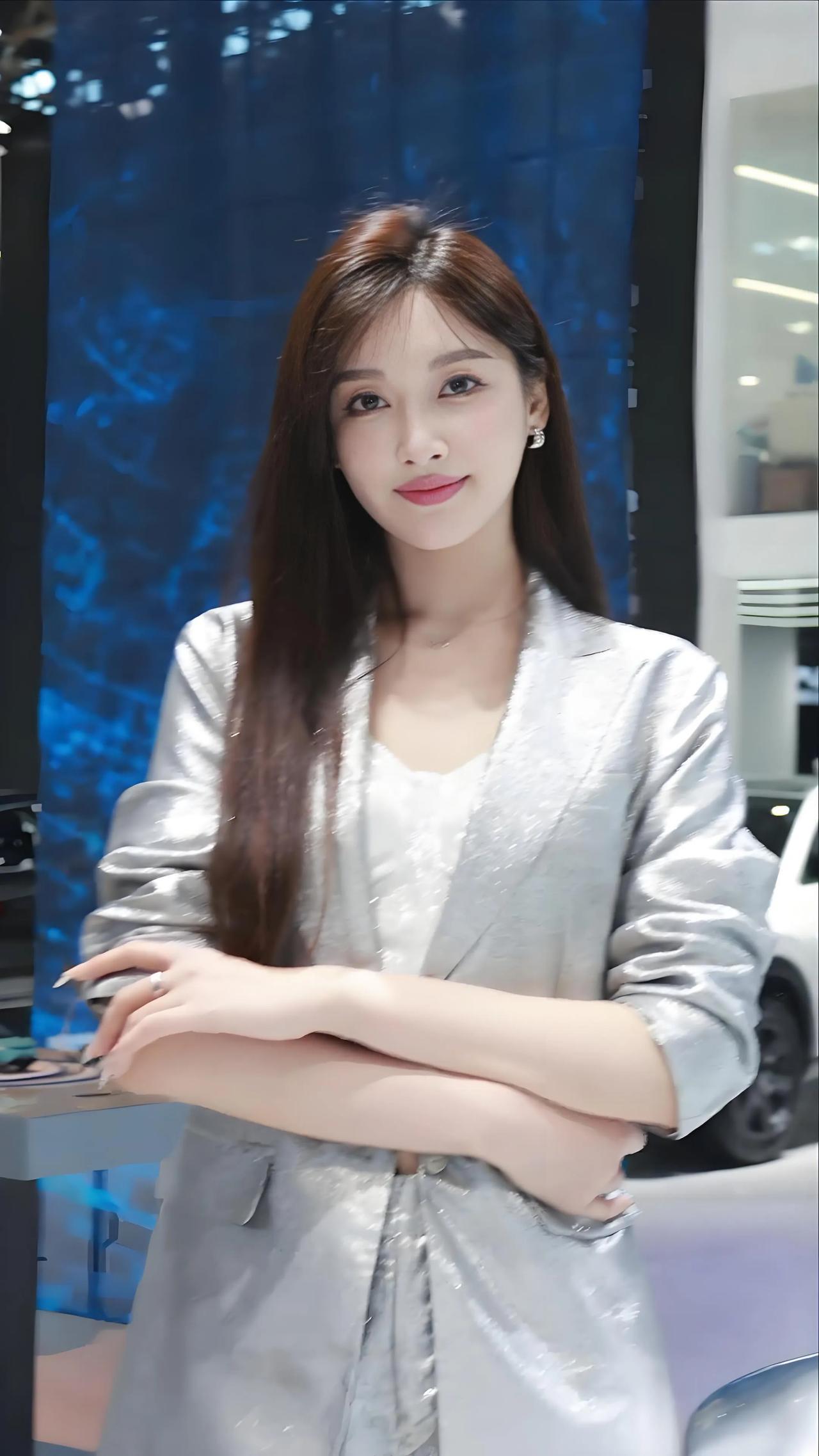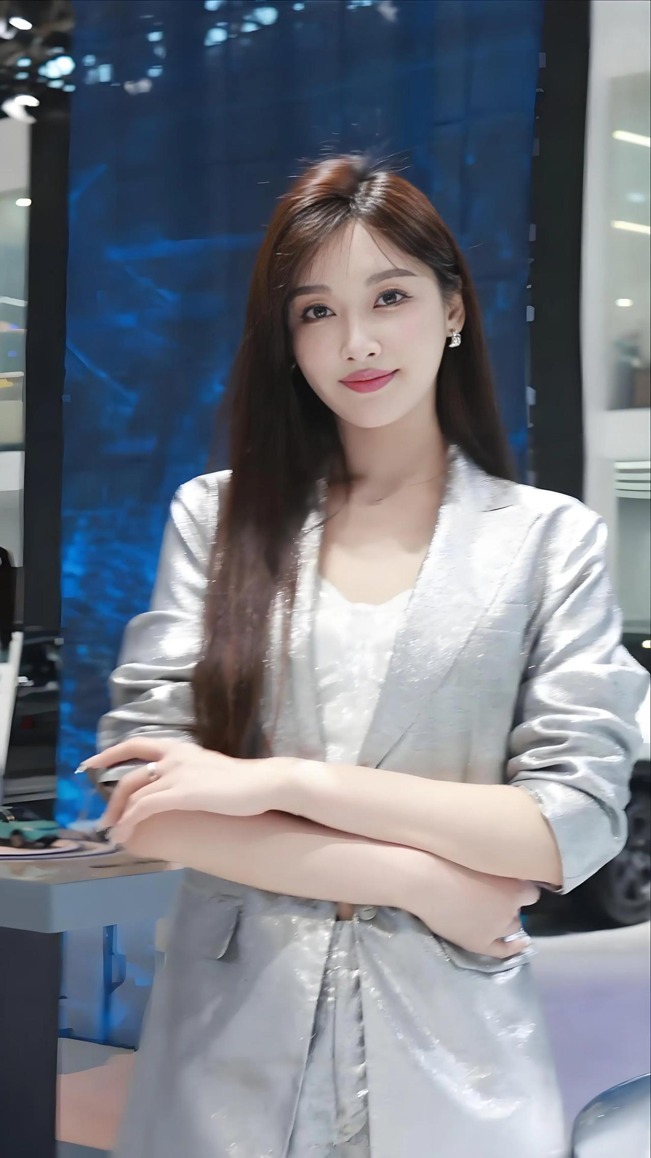 车展上,银灰色西装搭配白色内搭,尽显美女车模魅力!👗💄👠
