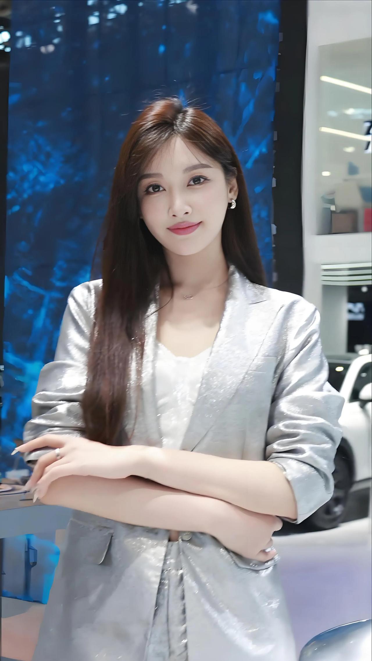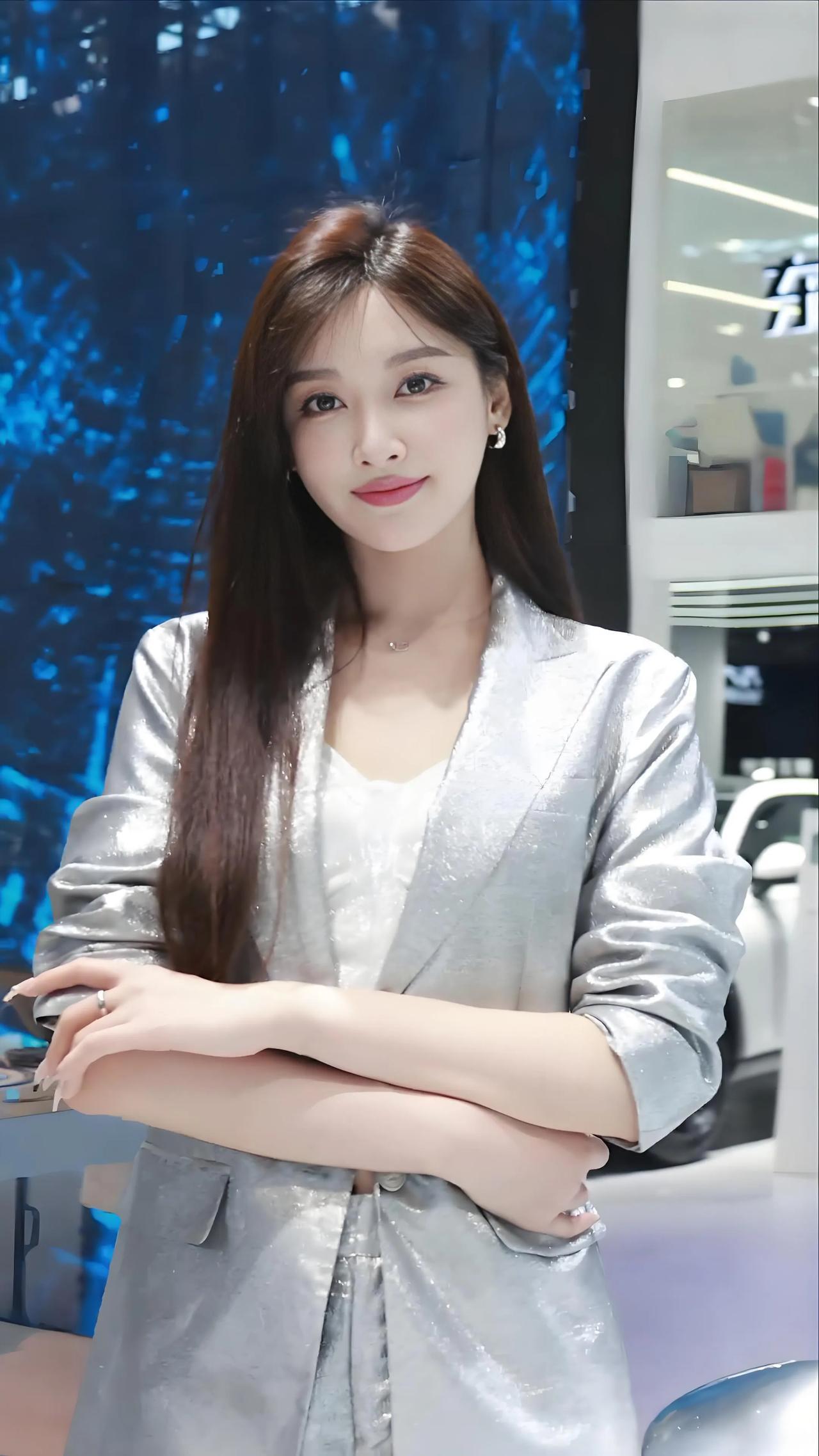 车展上,银色西装搭配白色内衣,尽显车模优雅与魅力!
