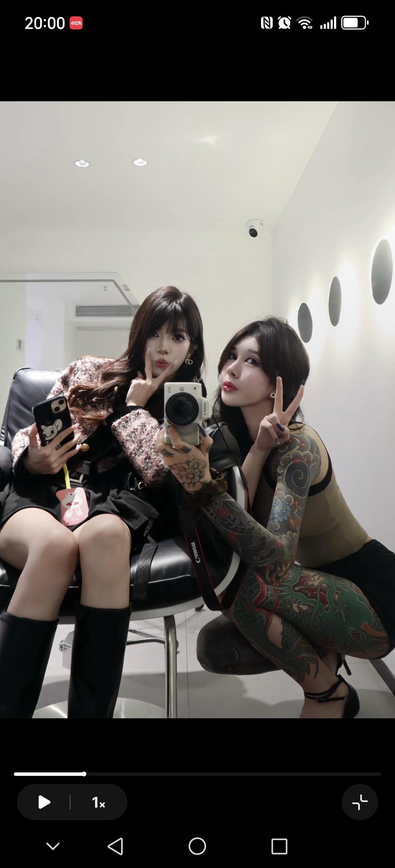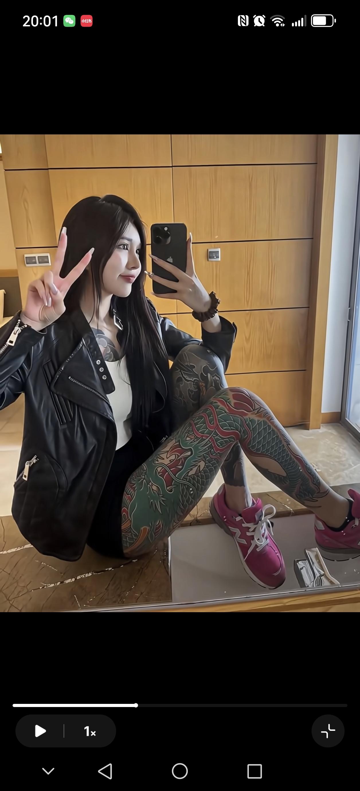 冬日夜晚,圣诞树旁,黑发美人,惊艳纹身,优雅高跟鞋,圣诞氛围浓。