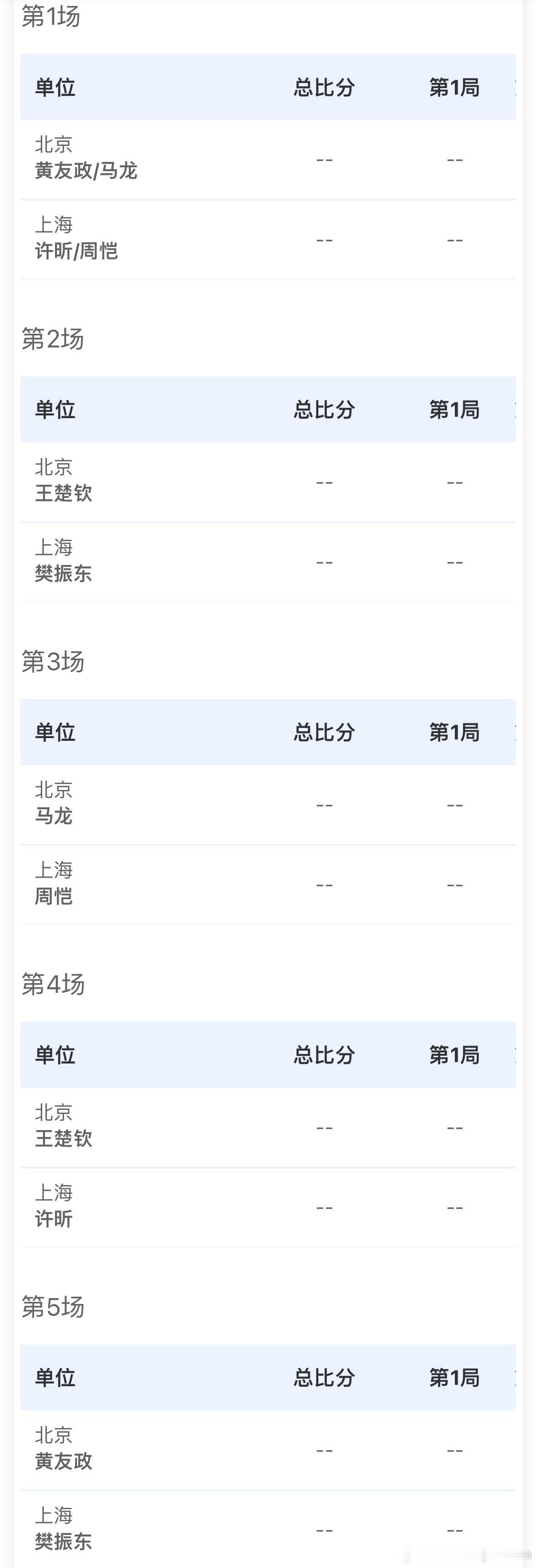 男子团体金牌赛北京🆚上海马龙/黄友政🆚许昕/周恺王楚钦🆚樊振东马龙🆚周恺王楚钦🆚许昕黄友政🆚樊振东