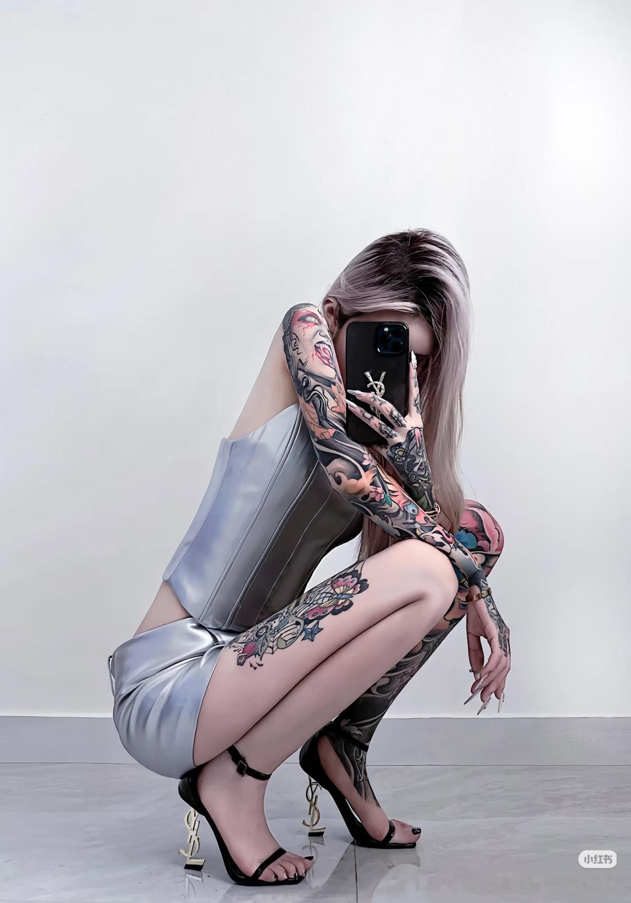 银色西装装美女车模倚白车,古风犹存意蕴长。