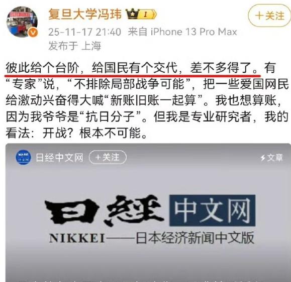 研究日本后反倒崇拜起日本了?复旦大学冯玮在微博就高市早苗涉华不当言论发文表示,中日双方彼此给个台阶,给国民有个交代,差不多得了。 搞日本研究的学者,到底该站在哪一边?这个问题最近被复旦大学的冯玮给搅热了,就因为日本的高市早苗在国会说了不当的涉华言论,他在微博上居然说“中日双方彼此给个台阶,差不多得了”,这话一出来,好多人都懵了。 高市早苗那番话的情况想必大家都已经十分清楚了。这话不是私下聊天说的,是在国家最高立法机构的正式场合讲的,性质完全不一样,属于公开挑战底线。 高市早苗这话说完没两天,作为复旦大学历史系教授、日本问题专家的冯玮就发了微博,他自己也承认高市早苗的言论触及了中国底线,可话锋一转就劝着“给台阶”,还说要“给国民有个交代”,这话听着就别扭,人家都踩到你脚背上了,你还主动递双鞋让他擦? 咱得搞明白,研究日本不是为了跟日本攀关系,更不是人家犯了错还帮着打圆场。就像老辈人常说的,知己知彼才能不吃亏,研究日本的目的,是弄清楚它的真实想法,找到它的问题所在,真要是有摩擦了,能帮着咱们占理儿,护着咱们自己的利益。 早年间有位叫戴季陶的学者,1928年写了本《日本论》,那才是研究日本的典范。他在日本待了好多年,把日本的社会、文化摸得门儿清,写这本书就是想让中国人彻底看懂日本,知道该怎么跟日本打交道,怎么维护咱们自己的权益,从来没说过“给台阶”这种软话。 冯玮的言论一出来,不光普通网友不买账,好些学界同行也觉得不妥。有位不愿透露姓名的历史学者就说,做区域研究的,立场比学问更重要,要是立场歪了,学问再大也没用,搞不好还会帮倒忙。 更让人不舒服的是,好多研究日本的学者,家里长辈都经历过那段艰难岁月,说不定就有抗日的先辈。要是先辈们知道,自己的后人研究日本研究到人家犯了错还劝着“差不多得了”,心里得多寒啊?这可不是小事,是忘了本。 高市早苗发表不当言论后,咱们的外交部已经明确表达了立场,态度坚决又有理有据,这才是该有的样子。作为研究日本的专家,冯玮本该借着自己的学问,好好分析高市早苗言论背后的意图,给大家讲明白其中的利害,结果倒好,跑去劝着“给台阶”。 做学问的人,尤其是研究外国的,得有个定盘星,那就是自己的国家和人民。莫因日日与外邦资料相伴,便忘却自身之根本,忘却当为谁奉献心力。学问是用来帮着自己人的,不是用来给外人找借口的。 真正的专家,应该是咱们的“眼睛”和“脑子”,帮着咱们看清外面的世界,帮着咱们想明白应对的办法。要是连立场都站歪了,那这双“眼睛”就成了歪眼,这颗“脑子”也成了糊涂脑子,根本没法指望他帮着咱们维护利益。 希望所有研究外国的学者都能记住,自己首先是中国人,再是研究某国的专家。先辈们拼着命守护的东西,不能在咱们这代人手里,因为几句“给台阶”的软话就打了折。立场正了,学问才有价值,不然再大的名气也站不住脚。 你身边有没有这种“越研究越向着对方”的情况?就像有人整天研究对手,最后反倒觉得对手什么都好,连对手做错事都能原谅。换作是你,要是遇到这种研究外国的专家说这种话,你会信他的观点吗?评论区聊聊你的看法。 信息来源: 新浪微博——2025-11-17 复旦大学冯玮个人发帖