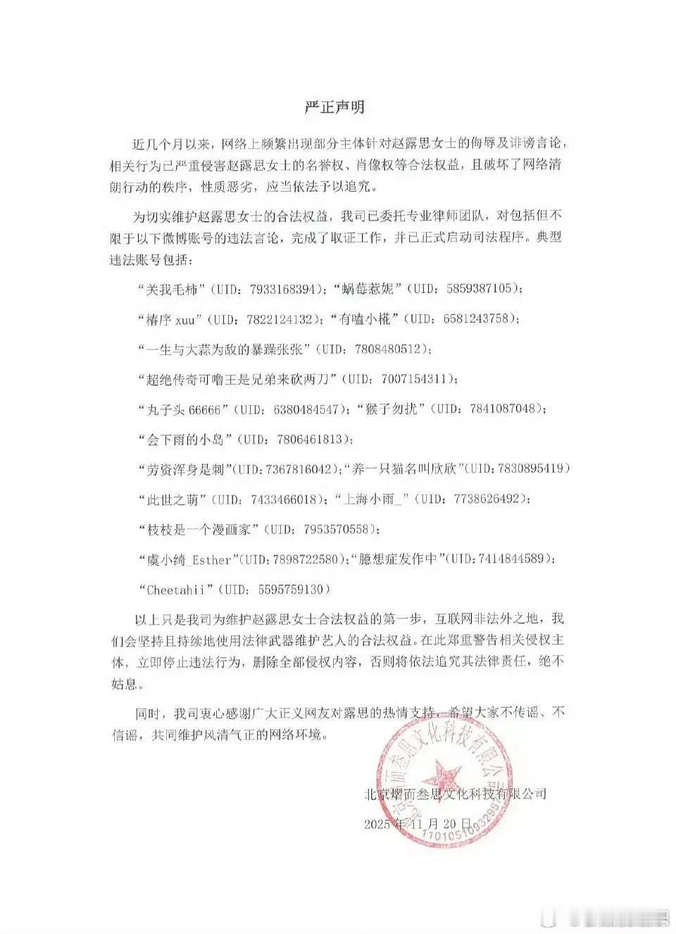 【】11月20日, 发布严正声明:“近几个月以来,网络上频繁出现部分主体针对赵露
