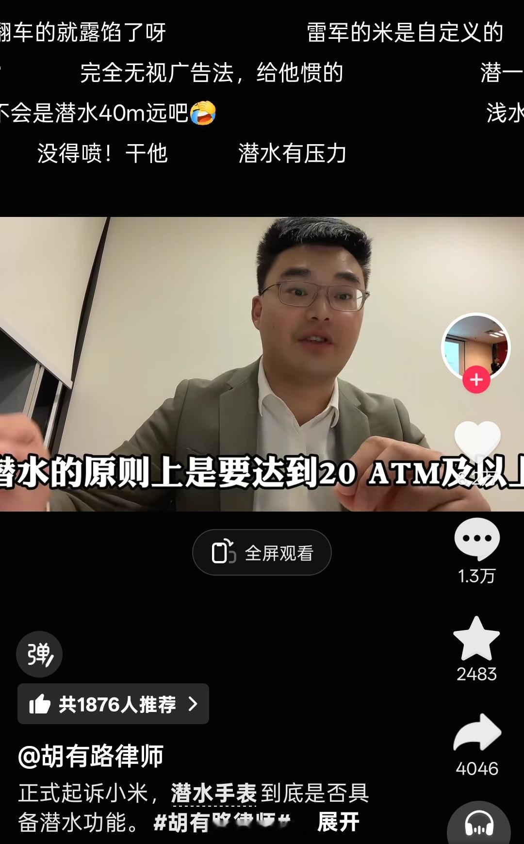 这位律师说要起诉小米,主要质疑小米Watch S4 Sport是否具备潜水功能,因为页面显示手表防水等级是5ATM,他表示潜水原则上要达到20ATM才行,他要确认能否达到宣传的潜水效果