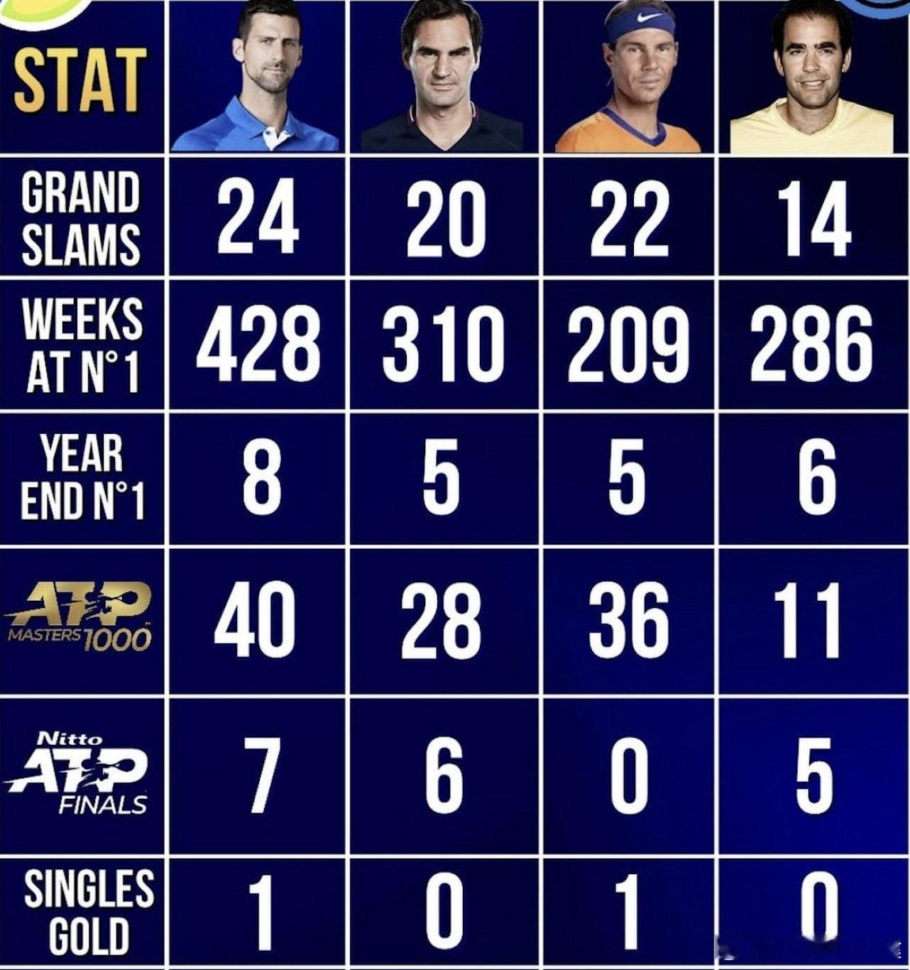 一张图看德约科维奇、费德勒、纳达尔和桑普拉斯的成绩对比