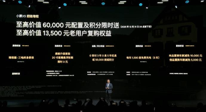 30.98-32.98万的小鹏X9在豪华MPV里面杀疯了 教授觉得这价格杀疯了,首当其冲的是腾势的D9,接着是丰田的赛那,基本全在攻击空间之内。而且小鹏这大7座是特别特别舒服的,30万出头,这基本就是这区间最有性价比的豪华MPV,别家看到还不赶紧降价吗? 下面是参数: 基础参数:5316*1988*1785mm,轴距3160mm(中大型MPV) 驱动形式:增程电动 布局:2+2+3(大7座) 发动机:1.5T(92号汽油) 发动机功率:85kW 电机功率:210kW 油箱容积:60L 充电平台:800v 充电倍率:5C 电池:磷酸铁锂电池 电池容量:63.3kWh CLTC续航:452km 综合续航:1602km 零百加速:8s 悬架:前双叉臂后H臂全铝悬架+双腔空悬+CDC减震+6个液压衬套(后轮转向) 外放电:220v、V2L、V2V(给其他车补能) 座椅:Nappa真皮座椅/主副驾电调+腿托+10点按摩/二排零重力座椅+腿托加热/三排四六分电动折叠/一键躺倒/二排折叠板/三排电调+176°可调 外观:青/紫/白/黑/银/灰 内饰:棕/灰/咖 轮毂:19寸/20寸轮毂 智驾芯片:图灵AI芯片(1-3颗) 辅助驾驶:NGP+全场景VLA 智驾硬件:毫米波+超声波+DMS+OMS摄像头 音响:23扬声器/27扬声器 屏幕:21寸HUD+10.25液晶仪表+17.3悬浮中控+后排21.4娱乐屏+流媒体后视镜 其他配置:9气囊/主动降噪/香薰系统/10.8L冷暖冰箱/360影像/无麦K歌/三排电折叠 30.98万 1602Max版 1*图灵 真皮座椅+方向盘加热+头枕扬声器+50w*2无线充/二排遮阳帘 前排静音电吸门/防夹侧滑门/外后视镜加热/智能电尾门/天幕遮阳帘 一二排隔音玻璃+二三排私隐玻璃/真木内饰/麂皮顶棚/迎宾光毯 32.98万 1602Ultra版 3*图灵+VLM私人管家 上市权益: 送20寸悬浮轮毂 送座舱升级套装(头层Nappa真皮/二排腿托加热/27扬/AI音响/智能香薰) X9的老车主可以获得最高13500元购车补贴 选配套装: 极光青 6000 星舰灰 8000 云间玫棕 3000【来自懂车帝车友圈】