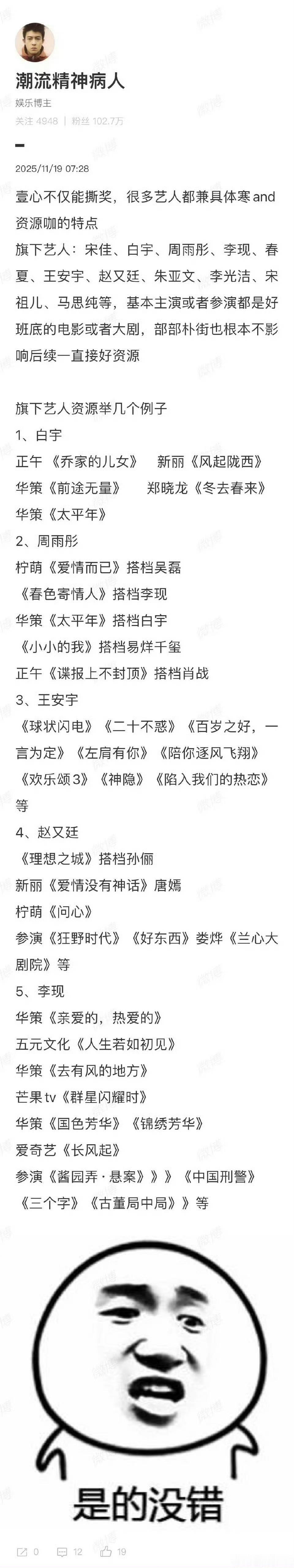 李现再差也爆过好吧而且亲热开机的时候没人觉得是多好的资源,只是就是爆了而已从人生之后都是流量生or糊了但有“认知度”的后流量生的状态,这些资源不是很正常?跟白宇周雨彤他们比还好了
