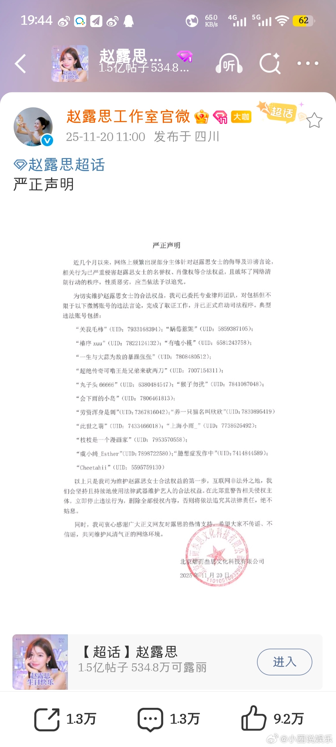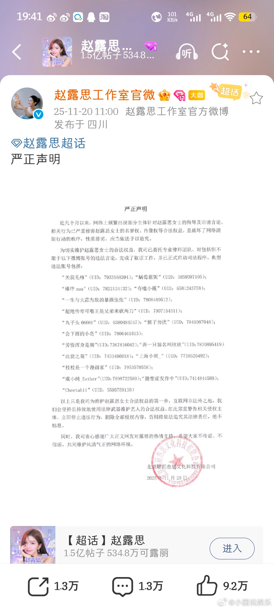 【】11月20日, 发布严正声明:“近几个月以来,网络上频繁出现部分主体针对赵露思女士的侮辱及诽谤言论,相关行为已严重侵害赵露思女士的名誉权、肖像权等合法权益。为切实维护赵露思女士的合法权益,已委托专业律师团队,完成了取证工作,并已正式启动司法程序。”支持维权支持露思