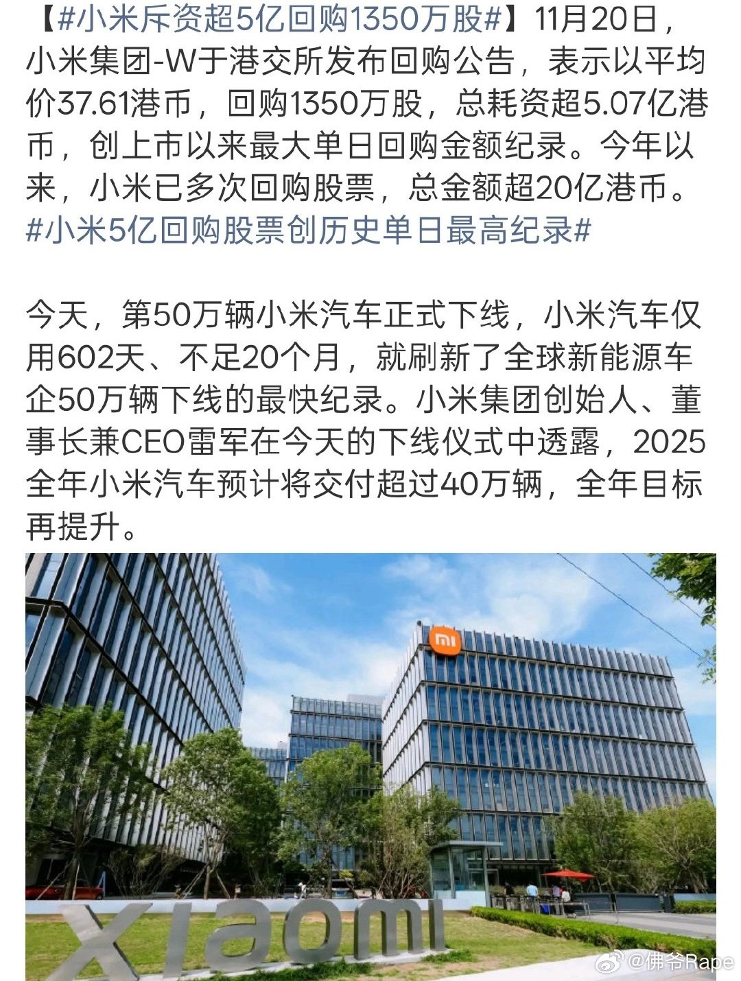 小米5亿回购创纪录 小米汽车50万台下线一边砸5亿+回购护盘,创上市单日最高纪录,今年已累计超20亿,这格局够稳👏一边602天冲50万辆,刷新全球新势力最快纪录,2025年剑指40万交付!双线发力,小米这波操作,懂的都懂~