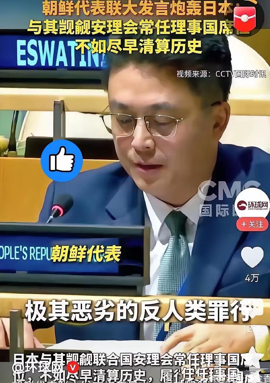 朝鲜已经心领神会! 朝鲜是真可交,在中方多次提出对日方的不满后,朝方也是积极跟进,朝鲜代表在联合国大会的发言,堪称直接炮轰日本军国主义,字字戳中要害。 日本军国主义当年造的孽刻在亚洲人民骨子里,可它至今不认错、不赔偿,还想篡改历史,这般无底线操作早该被硬刚。朝鲜敢站出来不是跟风,是懂历史重量、守正义底线,这份不怵强权的勇气,比啥都珍贵。 国与国之间的正义共鸣从不用抱团,中方立立场、朝鲜呼应,不过是想告诉世界:歪曲历史者终会被孤立,那些洗白侵略的小动作全是自欺欺人。你觉得朝鲜这波仗义执言,最戳你的是勇气还是这份正义默契?来评论区说说~
