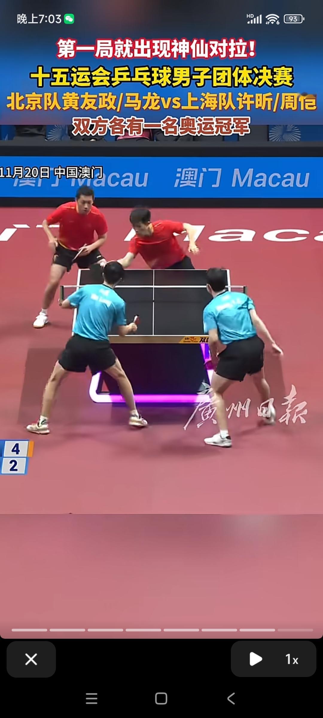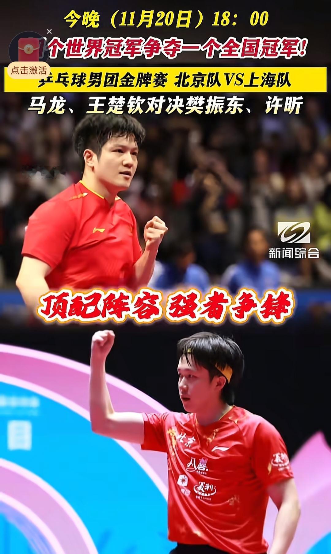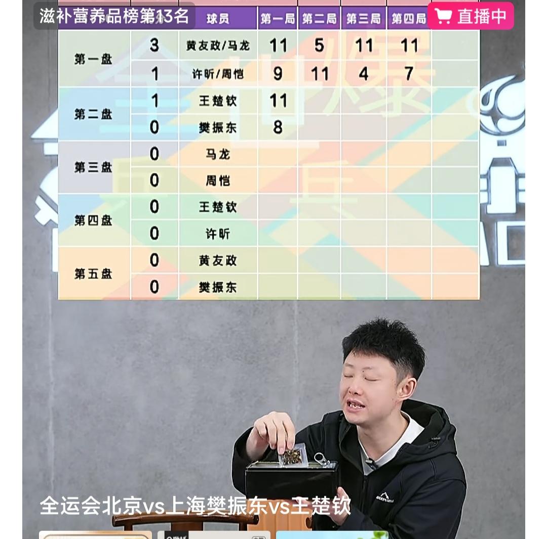 看女队乒乓球,我很紧张,看男队的话,就是享受,谁赢都可以。 双打第一盘赢了之后,我觉得冠军90%会是北京队了,不管王楚钦能不能赢樊振东,北京队都会赢。 第一,王楚钦一定会赢许昕; 第二,马龙一定会赢周恺; 上海队有点像河北队那样,樊振东就算一人独得2分也会遗憾收场。