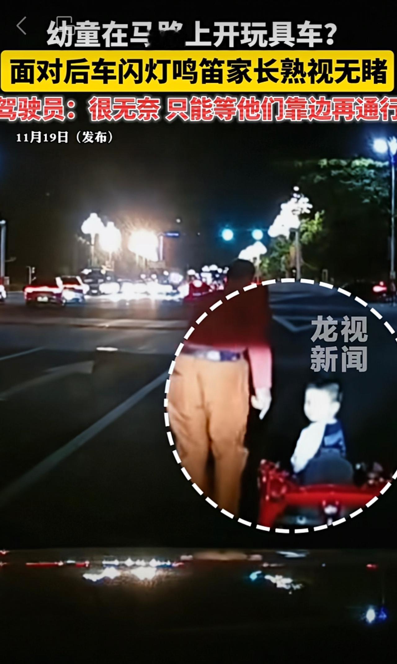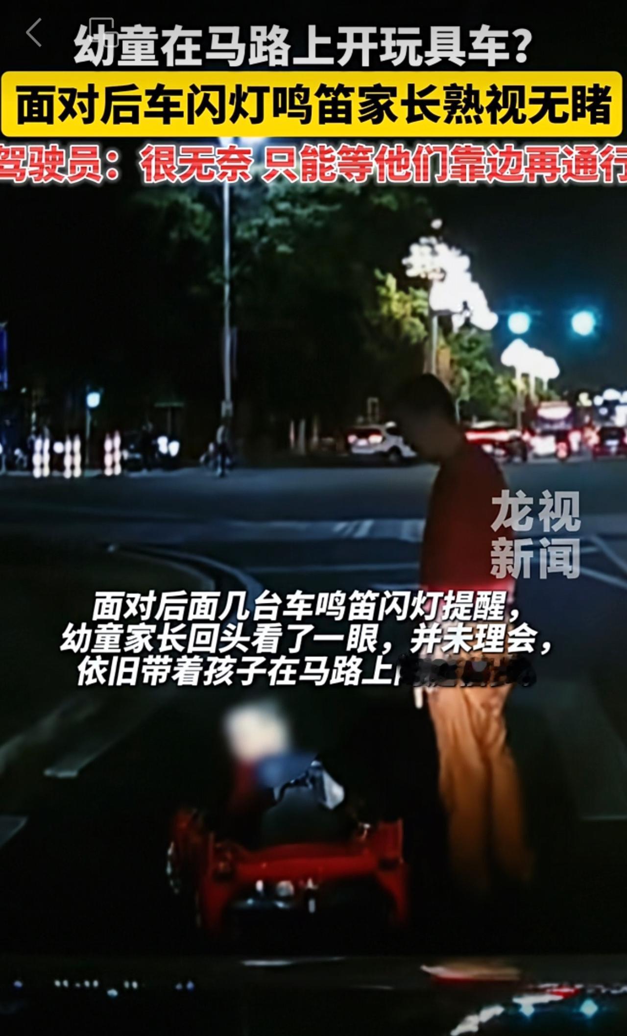 幼童在马路开玩具车,面对后车闪灯鸣笛家长竟熟视无睹。交通安全玩具车