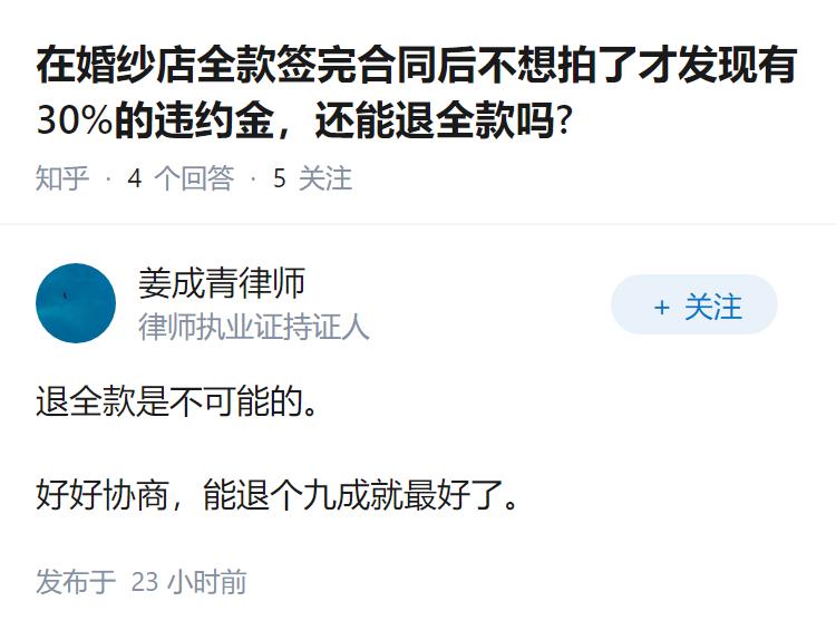 在婚纱店全款签完合同后不想拍了才发现有30%的违约金,还能退全款吗?