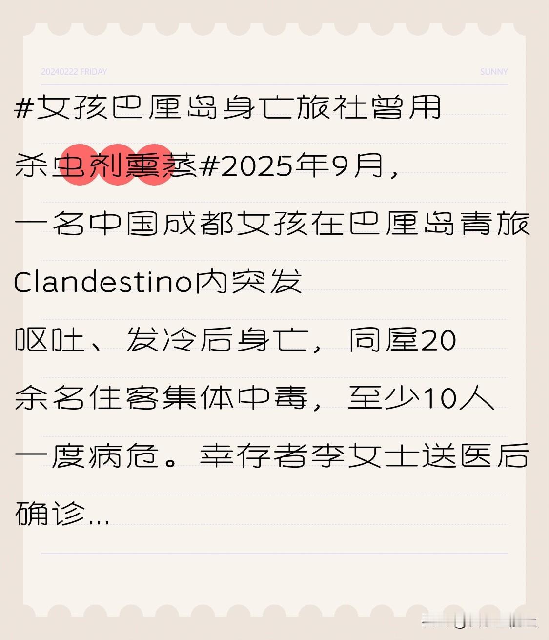 2025年9月,一名中国成都女孩在巴厘岛青旅Clandestino内突发呕吐、发冷后身亡,同屋20余名住客集体中毒,至少10人一度病危。幸存者李女士送医后确诊重症肺炎,其主治医生指出症状"更符合杀虫剂中毒并伴随食物中毒"。 据报道,该旅社事发前曾用杀虫剂熏蒸床虱,但未彻底通风即接待住客。事发两月后,中毒源头仍无定论,涉事旅社竟仍在营业。多名受害者控诉旅社隐瞒风险,事发时工作人员甚至未及时救助昏迷游客。 此案警示:境外低价住宿需警惕卫生隐患,安全规范不容漠视。