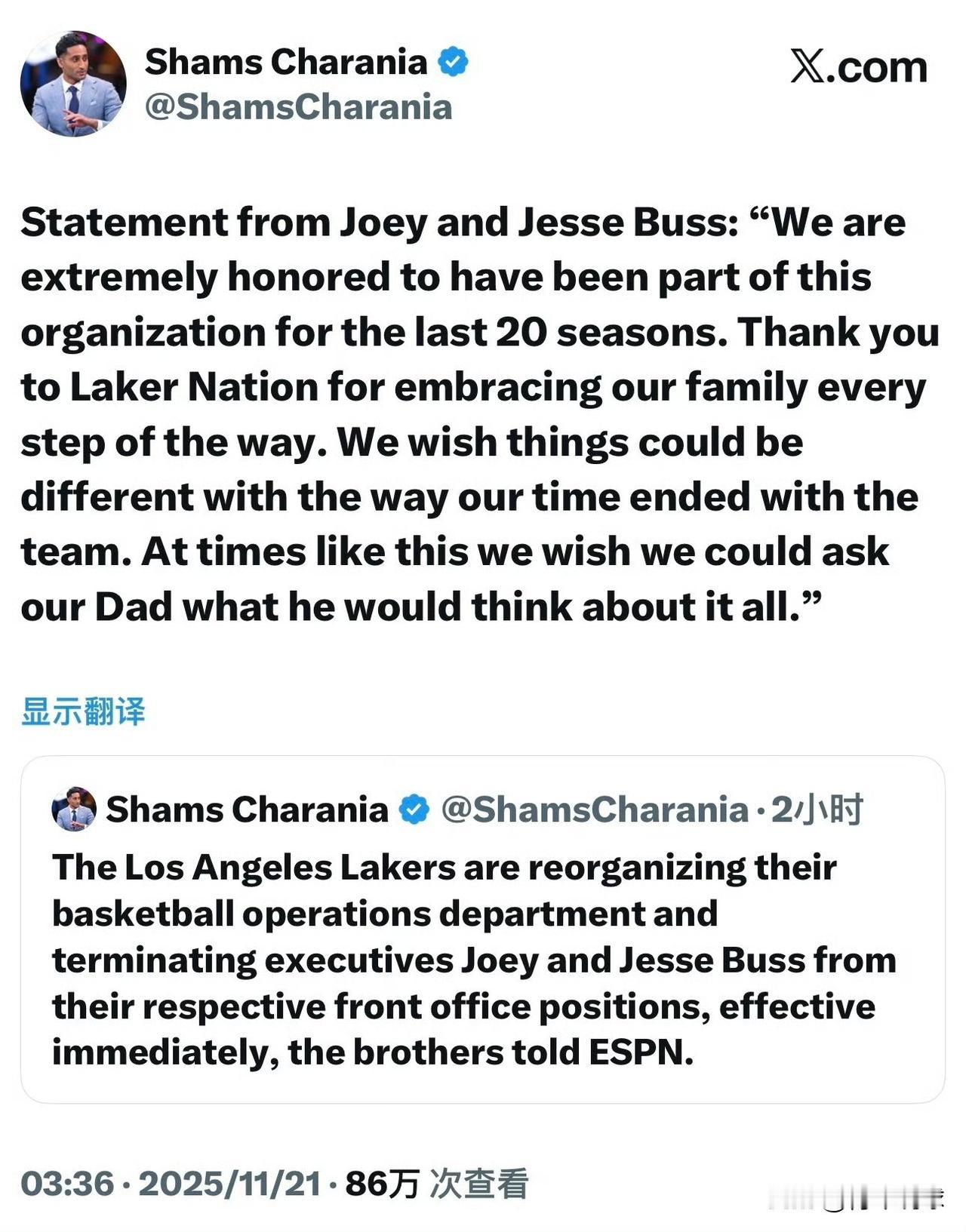 大洗牌!湖人队新老板开始动巴斯家族了! 据权威记者Shams报道:洛杉矶湖人队