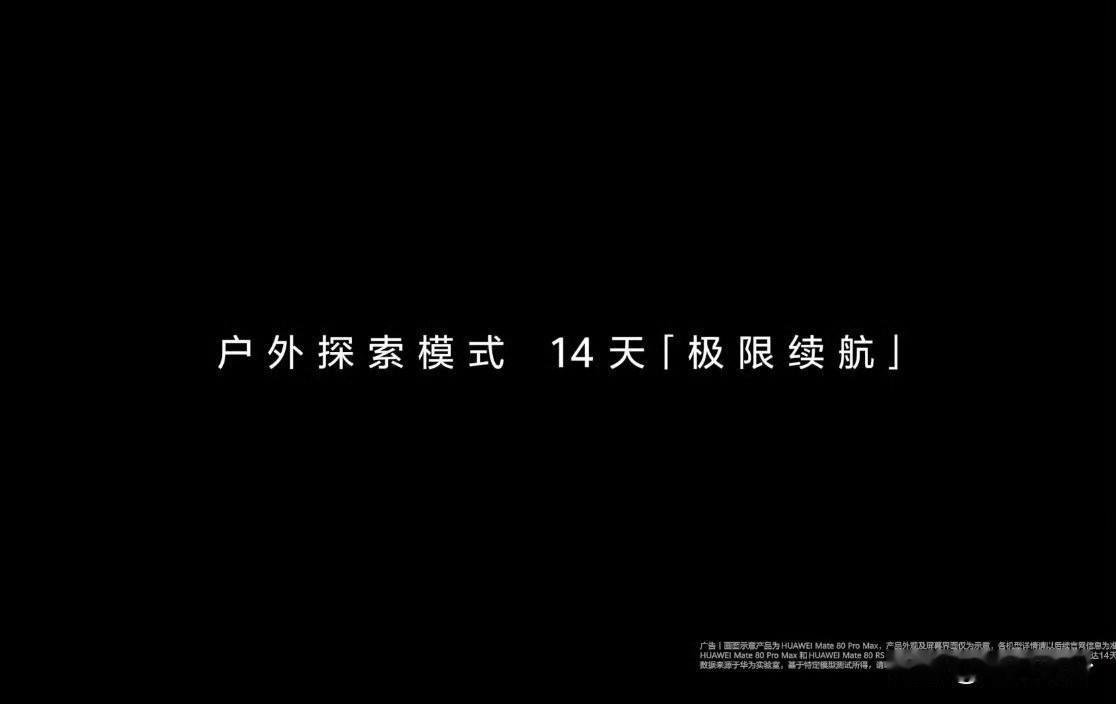 你能相信华为 Mate 80 户外续航可达 14 天吗? 华为官方发布了一段视频,显示 Mate 80 系列若开启户外探索模式,能够实现 14 天的极限续航。 若 14 天极限续航真能实现,那将远超市面上所有手机,真实情况如何,需等手机真正发布后,大家亲身体验才能知晓。 不过,相信官方发布此续航情况,应该是经过测试的,否则也不会轻易发布相关视频。 发布会后,我们可以测试一下它是否真能做到 14 天续航。 mate 80