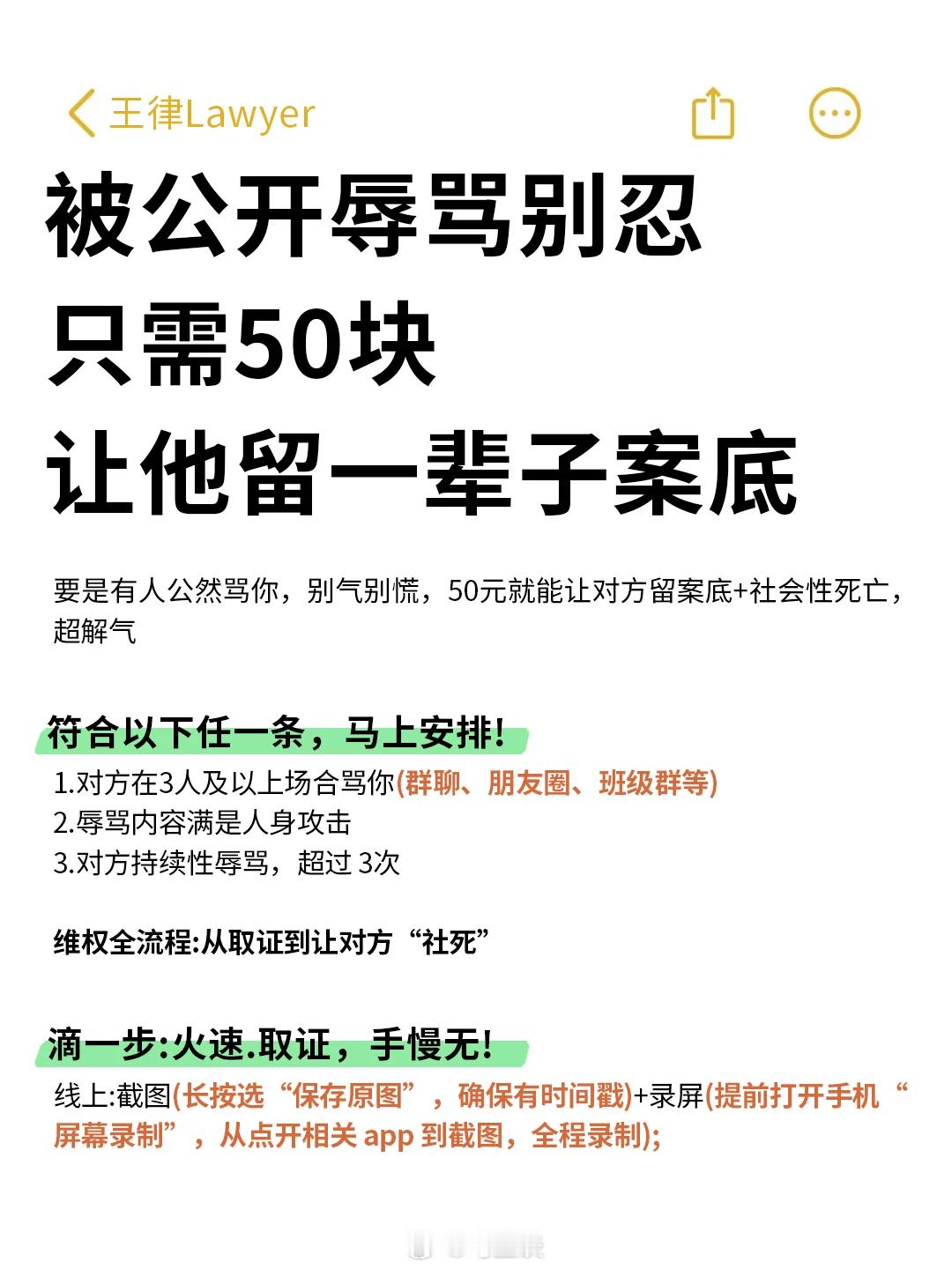 被人网上公开辱骂怎么办?转了一个律师的教程,50元就能让对方留案底!我希望在网上随意辱骂他人的人,都能收到严厉处罚。如今网上随意辱骂他人的现象比较普遍,大多时候这些渣渣都受不到应有的处罚。因为普通人没有时间和精力去起诉,但伤害却是由善良一方的网友承受了。如果是心理承受能力好的网友气气也就罢了,如果是刘学州这样敏感的人群,可能一时就想不开训了短见…