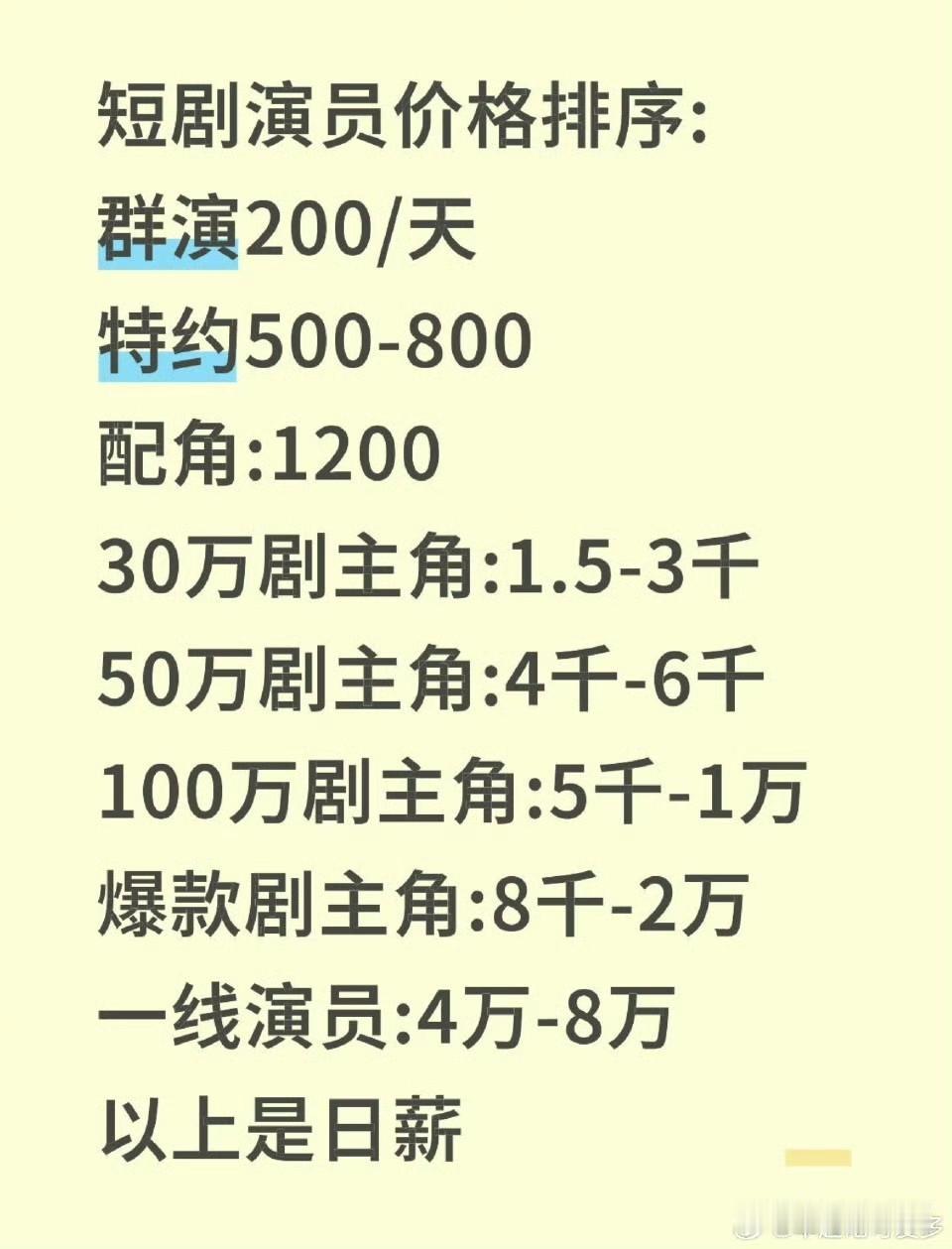 乖乖,难怪明星都去拍短剧呢,看了短剧价格表,我瞬间不淡定了: 有知情人士爆料,最便宜的群演,一天也有200块,特约群演500-800,配角1200/天,主演的价格也各不相同的,就拿爆款短剧来说,主角一天大概5万左右,正常一个剧拍7-10天,平均一个短剧薪资最少也有35万。 而且,很多短剧演员,都没有签公司,不需要上交60%的份额,拿到手还是很多的。 如今,影视圈进入寒冬,很多演员都无戏可拍,短剧演员本子却接不过来,有些人常年无休,这收入,快赶上一线明星了吧。 网友:我也想拍短剧。[偷笑] 不过,短剧看多了,也会审美疲劳,你们最喜欢哪个演员呢?