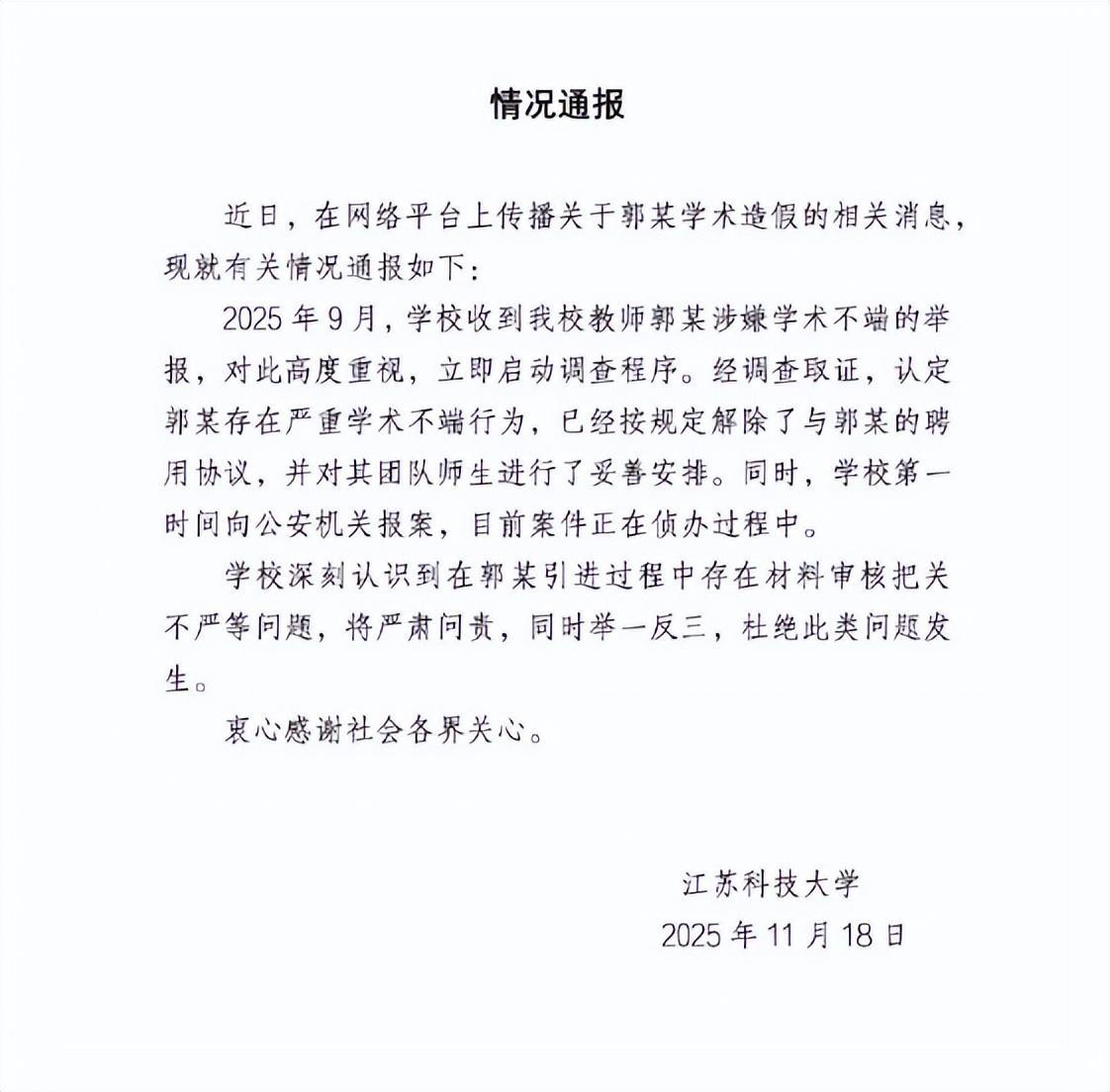 手段拙劣的郭某何以成为首席科学家?“高考状元”教授的全产业链造假 江苏科技大学材料科学与工程学院原教授郭某的学术生涯,宛如一座用谎言堆砌的、看似辉煌却一触即破的城堡。近日,其被揭露存在系统性、全方位的造假行为,其胆量之大、范围之广,令人瞠目结舌。从伪造“陕西省高考状元”这一根本身份,到编造子虚乌有的海外学历;从生搬硬造170余篇SCI论文的发表记录,到窃取“国家科技进步奖”等顶级荣誉,甚至虚构“德国洪堡青年学者”等国际知名头衔——郭某构建了一个几乎无懈可击的“完美”人设,并以此成功骗取高校教职。 “画皮”式造假与监管的全面失守 此案已非简单的论文抄袭或数据瑕疵,而是一场彻头彻尾的“画皮”式欺诈。令人震惊的是,这套完全建立在虚假之上的履历,竟然能通过入职时的层层审核。这暴露出高校在人才引进背景核查环节可能存在严重的形式主义,对光鲜头衔的盲目迷信,压倒了对基本事实的严谨求证。当造假者发现,伪造整个“学术宇宙”比踏实发表一篇真论文更容易获得认可时,制度的漏洞已如同敞开的大门。 “唯论文、唯头衔”积弊的恶果 郭某事件是当前“唯论文、唯头衔、唯奖项”学术评价体系下结出的一个极端恶果。在功利导向的驱使下,一些人不惜铤而走险,通过伪造“硬通货”来快速兑现学术地位和资源。而繁忙的评审体系往往无暇、也缺乏有效技术手段去逐一核实海量申请者的每一项声称,使得系统性造假有了可乘之机。 零容忍与体系重构 校方解除聘用并报案的处理是必要的第一步,但反思不应止于此。此案警示我们,必须建立更严格、更透明的学术信用体系,引入跨部门联动的背景核实机制,并对造假行为实施终身追责的“零容忍”政策。唯有彻底铲除滋生“郭某”的土壤,重塑风清气正的学术生态,才能让真正的学者安心问学,让公众重拾对科学殿堂的信任。