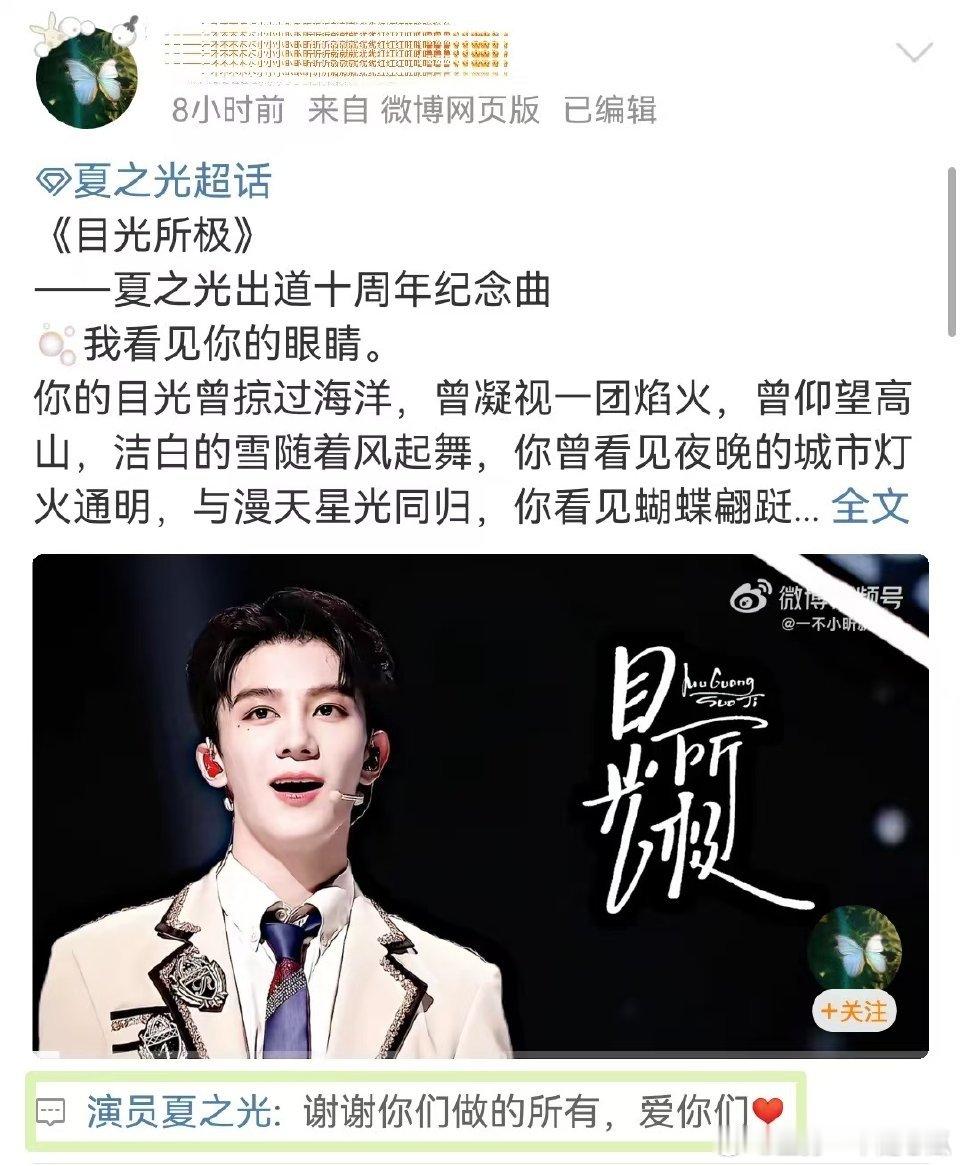 夏之光出道十周年粉丝原创应援曲《目光所极》,光光本人取的名字,共同创作的双向奔赴爱意!