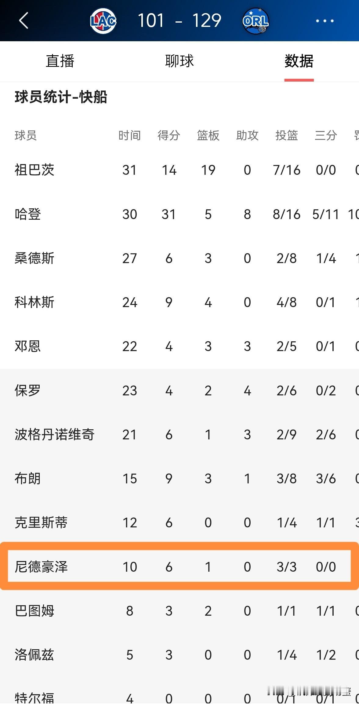 快船年轻中锋尼德豪泽真是太惊艳了!尽管今天快船在客场以101:129惨败于魔术,但是小将尼德豪泽破天荒的获得了替补出场的机会,并且表现惊艳。 全场比赛下来,尼德豪泽替补出战10分钟,投篮3中3得到6分1篮板1盖帽。 说实话,尼德豪泽完全可以取代老将大洛佩兹成为祖巴茨的第一替补,虽然尼德豪泽缺乏比赛经验,但是他可以为球队提供活力。