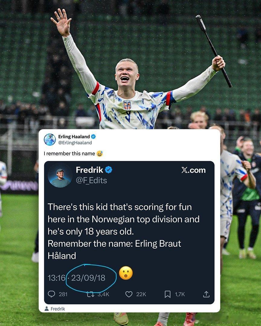 【过了7年还记得你】哈兰德社媒晒出记者Fredrik在2018年发布的推文:“挪威顶级联赛有一个少年,进球如同探囊取物,而他只有18岁。请记住这个名字——埃尔林·布赖于特-哈兰德。”哈兰德特意圈出当年的发布日期(2018年9月23日),并写道:“我记得这个名字😅”