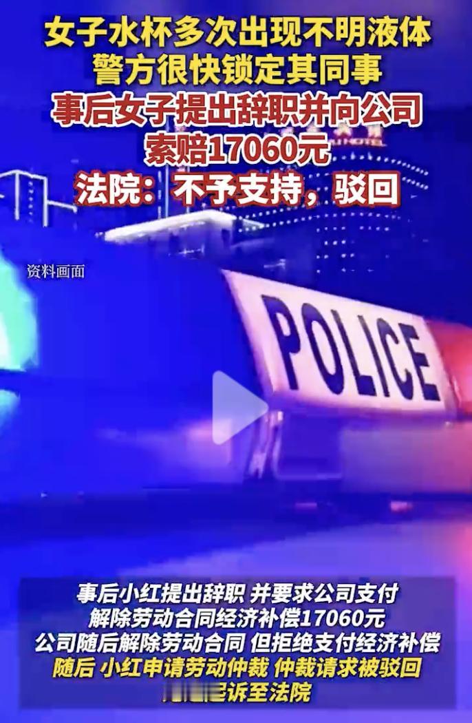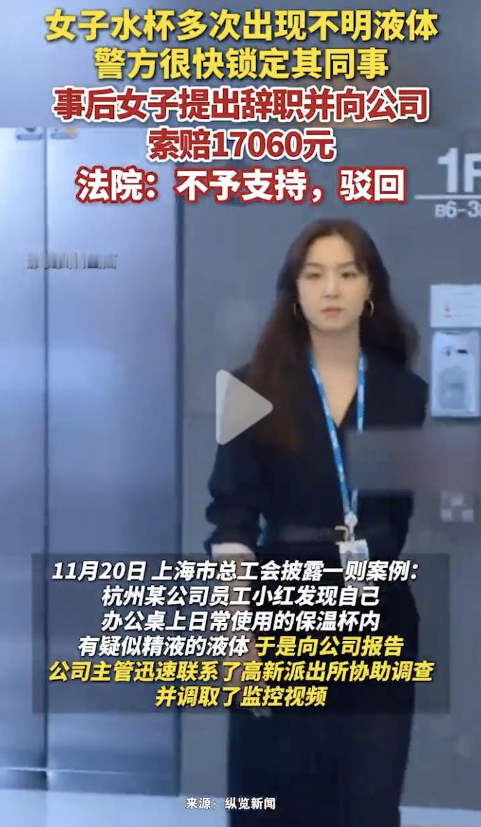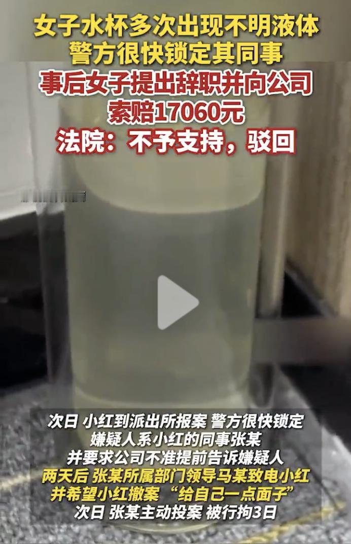 “太恶心了!” 女子小红是杭州某公司员工,一天小红在准备用杯子喝水时,突然发现不对劲,办公桌上的杯子里出现了不明液体,而且看着疑似是精液。 这下可把小红吓坏了,联想到最近自己的杯子里已经多次出现不明液体,在自己喝水的杯子投放不明物质,这可不是小事,于是小红赶紧向公司报告了这件事。 公司主管听完小红的叙述后,立即联系了当地派出所协助调查,通过调取办公室监控视频,警方很快确定了嫌疑人是小红的同事张某,为了不打草惊蛇,警方要求公司不要向张某透漏消息。 但是没想到的是,小红接到了张某部门领导马某的电话,电话中马某给自己一点面子,把案子撤回,小红没有同意。让小红更没想到的是,当天下午,张某自己主动到派出所投案自首了,这一看就是马某向张某透露了消息。 最终,张某受到了惩罚,被依法行政拘留3日。但是出了这样的事情以后,小红的精神受到了伤害,再加上公司的处理方式也让小红无法接受,于是小红提出了辞职,并向公司索赔17060元赔偿。 但是,遗憾的是,经过劳动仲裁和法院审理,小红的诉讼都被驳回,没有得到支持。 在这件事中,张某的行为已经严重威胁到他人的身体和精神健康,受到惩罚是罪有应得。公司违规将消息透露给张某,并劝小红撤案,这种做法非常令人失望,这种公司无法给员工一个安全的工作环境,不待也罢。 在公司上班时,大家都要喝水,每个人都会有自己喝水的水杯,大家平时喝水时,有没有想过杯子里有可能被别人投放不明物质?都有哪些比较好的防范措施?