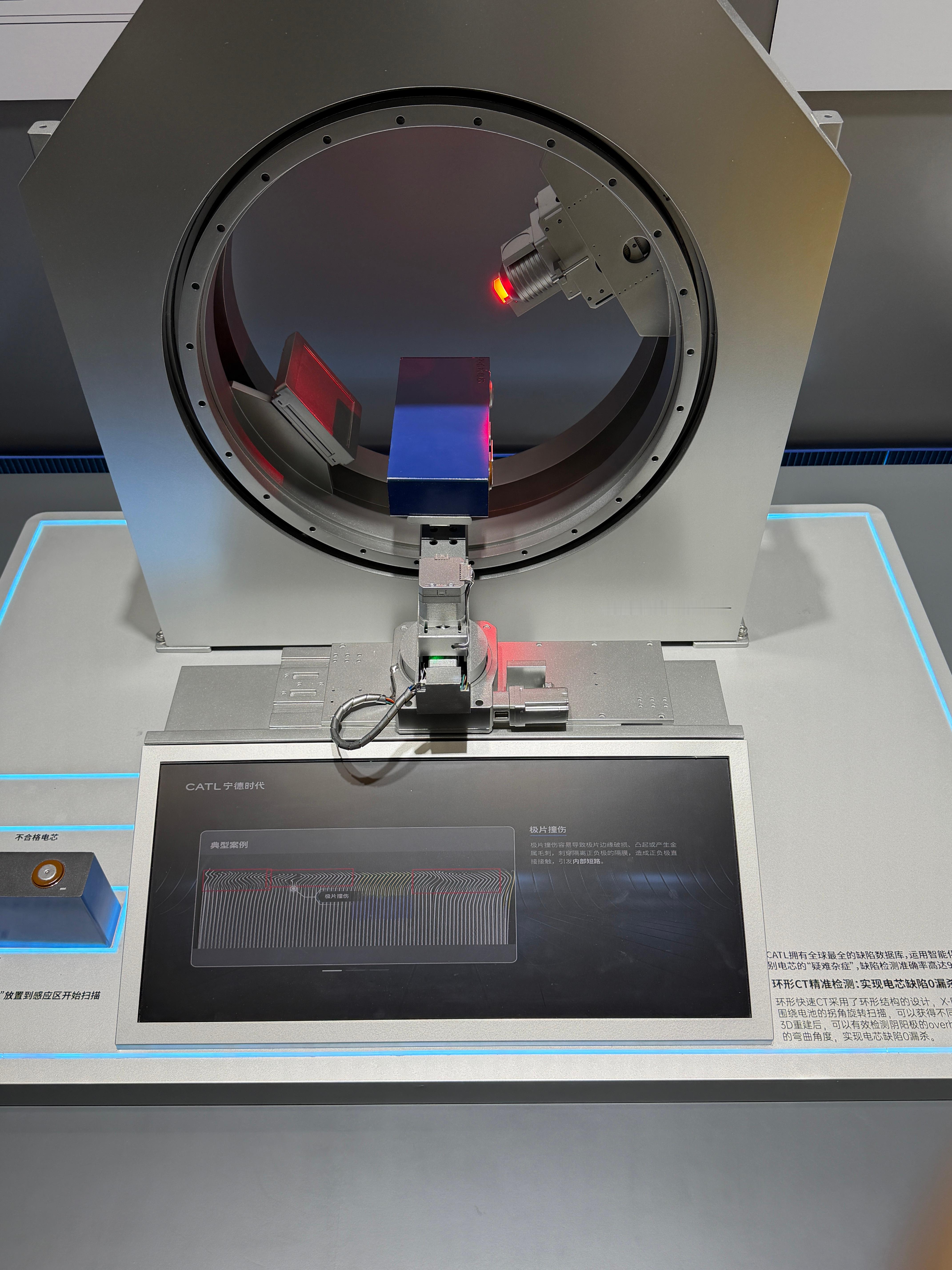 宁德电池的价值何在?PPB(十亿分之一) 级别的单体缺陷率,1000万台车仅一台有缺陷(假设一台车100电芯),宁德时代是行业唯一敢做此承诺的电池品牌现场还看到个电芯缺陷检测的小模型(图2),模拟 CT 探伤,那个探头转一圈,屏幕就会显示电芯缺陷在哪