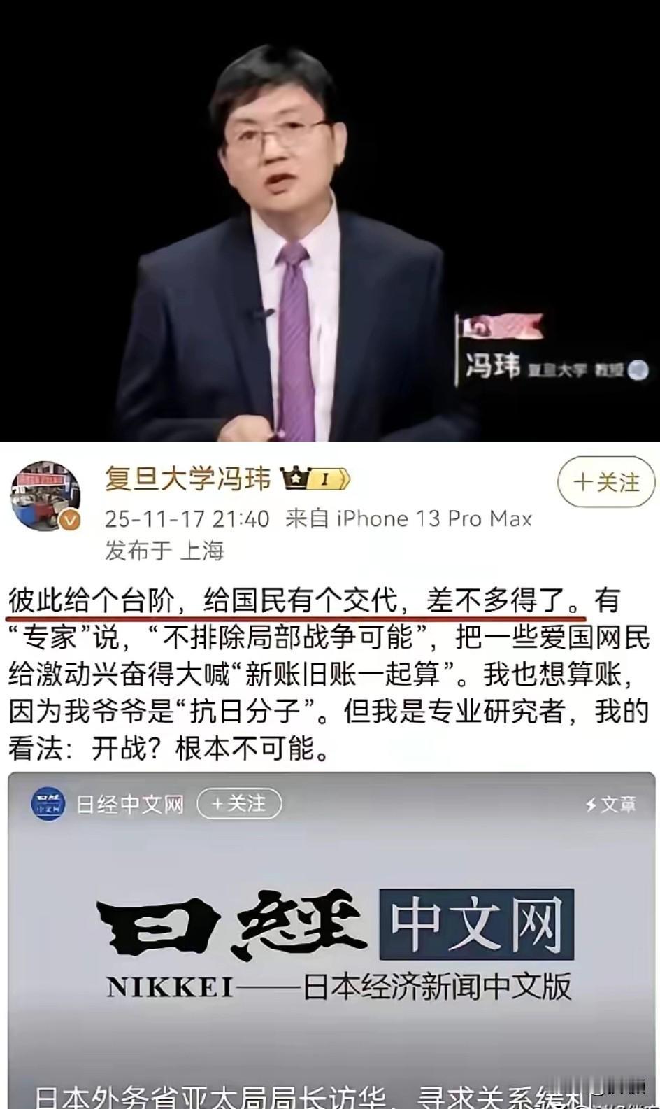 复旦教授冯玮那句“差不多得了” 可算是捅了马蜂窝,直接把网友们的怒火给点燃了!拿着国家给的待遇,却 劝受害者给加害者递台阶,这操作着实让人摸不着头脑。 历史教训还不够深刻吗?日本偷袭珍珠港,美国当初也觉得日本没那胆子,结果太平洋舰队遭受重创。如今面对日本,我们怎能不警惕?佩洛西窜台、南海争端,哪一次不是告诉我们,面对挑衅就得硬气,退一步只会让对方蹬鼻子上脸。冯教授所谓的“给台阶”,在我看来,那就是变相纵容,是对先辈抗日牺牲的漠视。 对历史要有敬畏之心,对挑衅必须强硬回应,这才是我们应有的姿态。