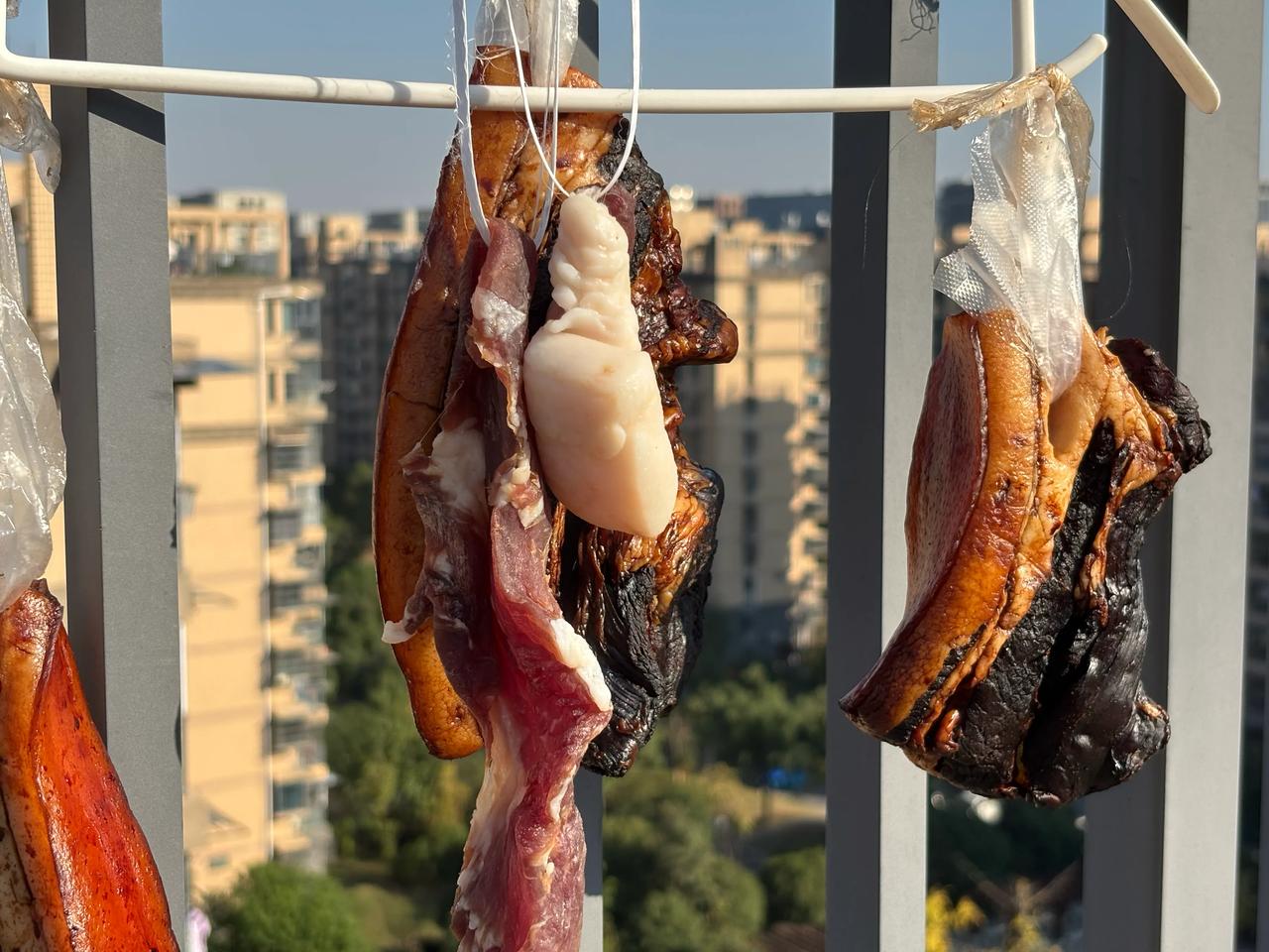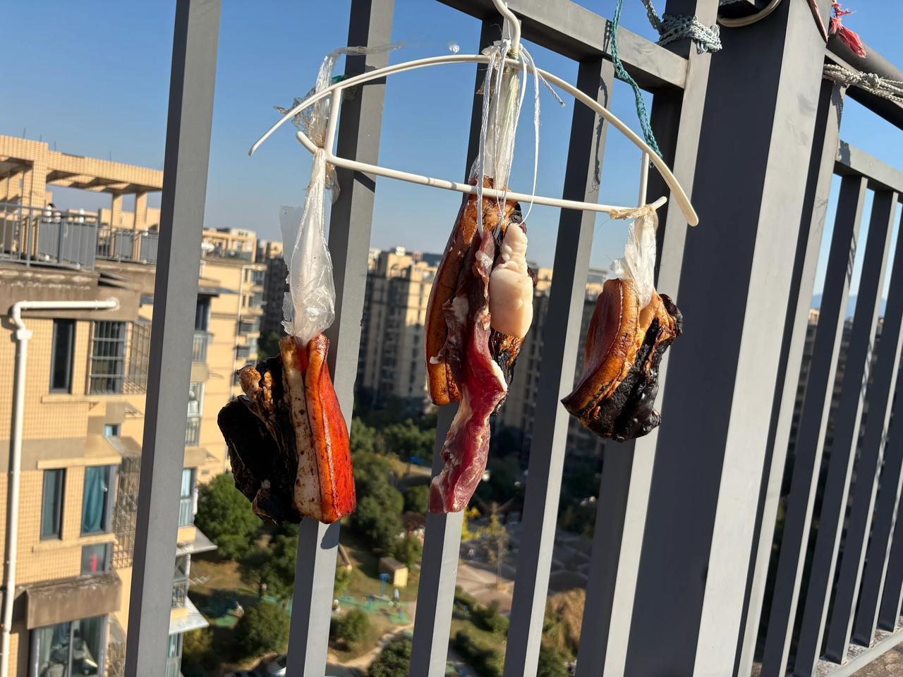 这是邻居腌制的肉,看着好诱人呀! 我是一个从来不吃腊肉的人看着都有点馋了。 烟熏暴晒是一种传统的古老的保存肉制品的方式,但千百年来却得到了很好的传承。 比起科技与狠活,这种简单直接的腌制和晾晒方式,更深得人们的喜欢。 你看这肉色泽鲜美,这脂肪多厚。 白 黑 红 黄四种颜色相聚一趟,看着多么的可人。 这种自然的景象和独特的风味一般只有在农村才能看到,偶然间在城市里也看到了这番景象是多么的难得呀! 这个邻居绝对是个吃货,而且是一个很有耐心,很懂生活的人。 这几块肥美鲜艳的肉,经过寒冬,到了明年春天。 我们拿出来,切成小块,然后可以放在热气腾腾的面里,也可以在炒菜的时候放入一些,岂不美哉。 【五花肉】沂蒙山土猪肉5斤当天屠宰 顺丰包邮