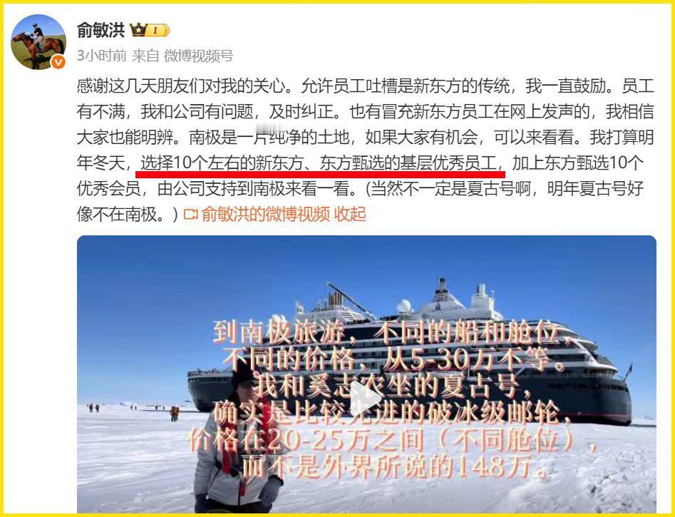 新东方创始人俞敏洪又放大招了,近日在社交平台账号上说,打算明年冬天挑选十个基层优秀员工和十个优秀会员,让他们去南极玩一玩,当然费用肯定是公司出。 去南极旅游是很多人想都不敢于想的好事,毕竟旅途遥远、费用不低,去一趟的钱都能买一套房子了。为什么俞敏洪会对员工这么大气呢?这都是由他几天前分享自己去南极旅游引起的。 他乘坐豪华邮轮享用美味西餐,晒南极冰天雪地的自然风光,与企鹅互动嬉戏。他在享受旅游愉悦的同时,还不忘发内部信,祝贺新东方成立32周年,感谢每一个员工的辛勤付出。 没想到员工没有与老板共情热血沸腾,反而吐槽说老板玩得嗨,我在办公室加班,今夜我们都是南极人。名人效应就是传播快,老俞去南极旅游的事上了热搜。他立马回应说鼓励员工吐槽是新东方的传统,公司会认真对待每个员工的诉求,并不断完善。 于是他说挑选一些优秀员工明年也去南极旅游,赢得了大家的好感和赞誉。老板和员工之间本来就有边界感,作为老板被吐槽后还耐心解释,并能提出改进措施,老俞算不错的了。 老俞是个有胸怀的老板,他面对困难的韧性,做人做事的真诚,深深感召了后辈年轻创业者以他为榜样,不畏挫折,勇于担责,回报社会。