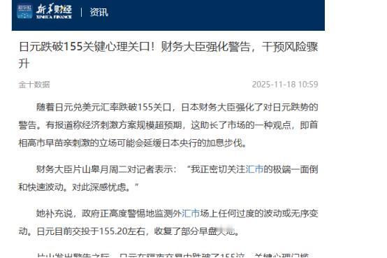 11月18日,据共同社报道,日本财务大臣片山皋月对“极为一边倒、迅速波动的”外汇市场表示担忧。因市场对日本财政状况的担忧,日元对主要货币出现贬值。   日本财务大臣片山皋月当着所有记者的面,脸色凝重地说现在的外汇市场“极为一边倒、波动快得吓人”,话里话外全是藏不住的担忧。这话可不是空穴来风,打开行情软件一看就知道,日元这波跌得有多疯,简直像一场没打招呼的超强台风,把平静的市场搅得底朝天。   咱们先看最直观的数字,这才是最有冲击力的。就在片山说话前几个小时,日元兑美元直接跌破了155这个关键关口,创下了近年的新低,虽然之后稍微收复了一点,但也稳稳站在155.20左右晃悠。   这还不算完,兑欧元更惨,直接跌破了180,这可是1999年欧元诞生以来头一遭,日元算是跌出了历史级别的弱势。不管是华尔街的投行交易员,还是东京街头的小老板,看着这个汇率曲线都直皱眉——这跌势也太没章法了,完全是一边倒的抛售潮。   片山皋月在发布会上还补了一句,说政府正“以高度的紧迫感”盯着市场,特别是那些投机者搞出来的过度波动。   明眼人都能看出来,这已经是赤裸裸的警告了,就差把“再跌我们就要出手干预”写在脸上。可市场根本不买账,毕竟大家心里都清楚,日元这波贬值不是偶然,背后藏着的是日本财政那本烂账,现在全被全球资本拿放大镜照着看呢。   有人可能会问,不就是货币贬值吗?至于这么紧张?那是没看到日本财政的真实家底。根据日本财务省最新的数据,2024年日本政府债务占GDP的比例已经达到了236.7%,虽然比2020年258.4%的峰值降了点,但这数字放在全球发达经济体里还是独一份的。   啥概念呢?相当于整个日本一年辛辛苦苦创造的所有财富加起来,还不够还2.3倍的债,这堆债务堆起来,比富士山看着还让人喘不过气。   更要命的是,日本马上要搞一个17万亿日元的经济刺激计划,光补充预算就14万亿日元,这么大一笔钱从哪儿来?还不是靠发新债,本来就沉重的债务负担,这下更是雪上加霜。     雪上加霜的是,隔壁美国的利率政策跟日本完全是两条路。可能有人听说了,美联储2024年已经降了三次息,现在利率维持在4.25%到4.50%之间,可即便如此,跟日本比还是高得吓人。   日本央行那边呢?直到2025年6月还全票通过维持0.5%的利率不变,而且要到2026年才开始逐步削减国债购买规模。   一边是4%以上的利率,一边是0.5%的利率,资本家们又不傻,肯定拿着日元去换美元啊,这就是传说中的套利交易——把日元换成美元存起来,光利息差就赚得盆满钵满,而且日元还在贬值,换回来的时候还能再赚一笔。   这么一来,全球资本都在甩卖日元,日元能不跌吗?最头疼的还是日本央行,手里捏着一大堆国债,就像捧着个滚烫的山芋,扔也不是抱也不是。   过去十几年,日本央行一直在放水刺激经济,买了海量的国债,现在要缩减购债规模都得小心翼翼,计划到2027年才能把每月购买量降到2万亿日元。   要是现在贸然加大缩减力度,国债价格肯定暴跌,整个银行系统都得跟着出问题;可要是不缩减,市场早就对放水免疫了,再多的钱扔进去也止不住日元贬值。就像一个人长期吃安眠药,现在药效越来越差,加剂量怕中毒,减剂量又睡不着,彻底骑虎难下了。   这波贬值最苦的还是普通日本人。超市里的进口牛肉、面粉价格蹭蹭往上涨,毕竟日本很多商品都靠进口,日元不值钱了,进口成本自然就高了,商家只能把成本转嫁给消费者。   加一箱汽油比去年贵了快三成,工资却没怎么涨,不少家庭都开始精打细算过日子。就连那些靠出口的大企业,表面上看日元贬值能让他们的产品在国外卖得更便宜,可原材料也大多靠进口,成本涨得比售价还快,利润反而被吞掉了不少,老板们也是愁眉苦脸。   更让人揪心的是,现在根本看不到扭转的迹象。片山皋月说刺激计划是因为7到9月日本经济六个季度来首次收缩,出口受美国关税影响下滑,不刺激不行。可刺激就得发债,发债又加重债务担忧,进一步拉低日元,形成了恶性循环。   就连高市早苗首相跟央行行长植田和男会面,也没拿出什么好办法。市场上都在猜日本会不会出手干预汇市,可之前几次干预效果都一般,现在这点外汇储备,能不能扛住全球资本的抛售还是个未知数。   说来说去,片山皋月的担忧根本不是汇率波动那么简单,而是日本财政的根基正在被撼动。这波日元贬值就像一面镜子,照出了日本经济积重难返的问题——高债务、低利率、经济增长乏力,每一个都是硬骨头。   现在全球资本都在盯着日本的下一步动作,要是处理不好,这波“台风”可能就会变成席卷整个经济的“海啸”。至于最后能不能稳住,恐怕连片山皋月自己心里都没底,毕竟这盘棋,实在是太难下了