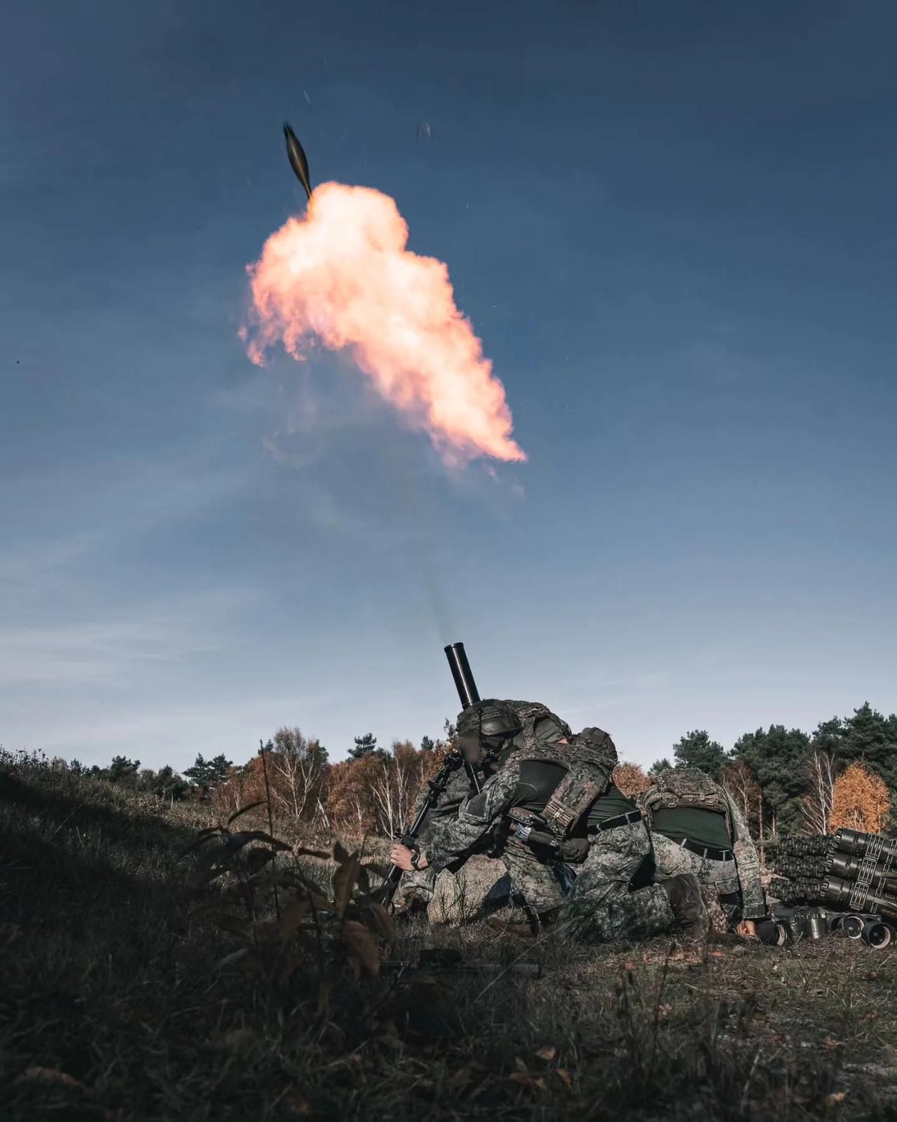 迫击炮弹离开发射管,荷兰皇家第 12 游骑兵营,范赫茨,德国,2025 年 11 月
