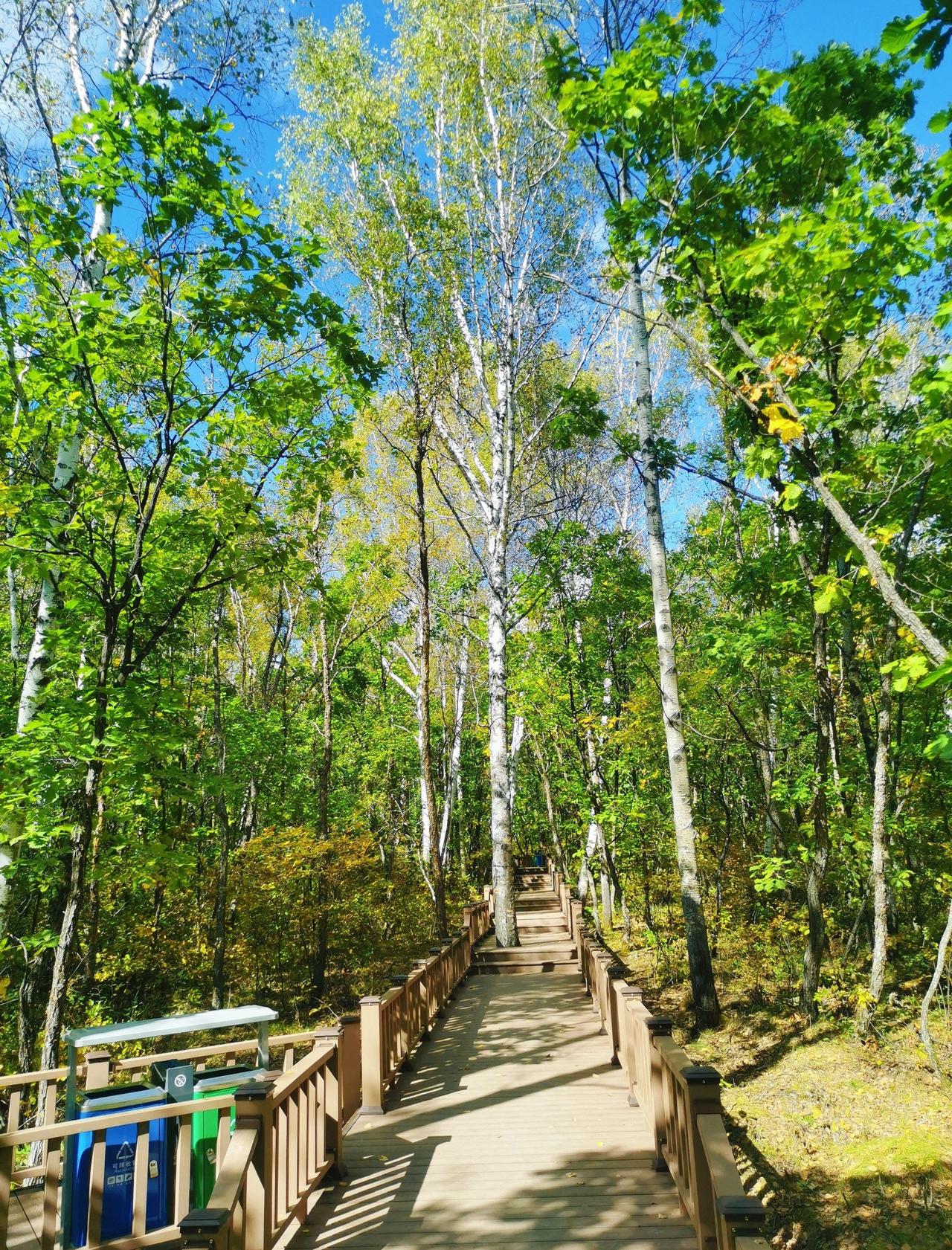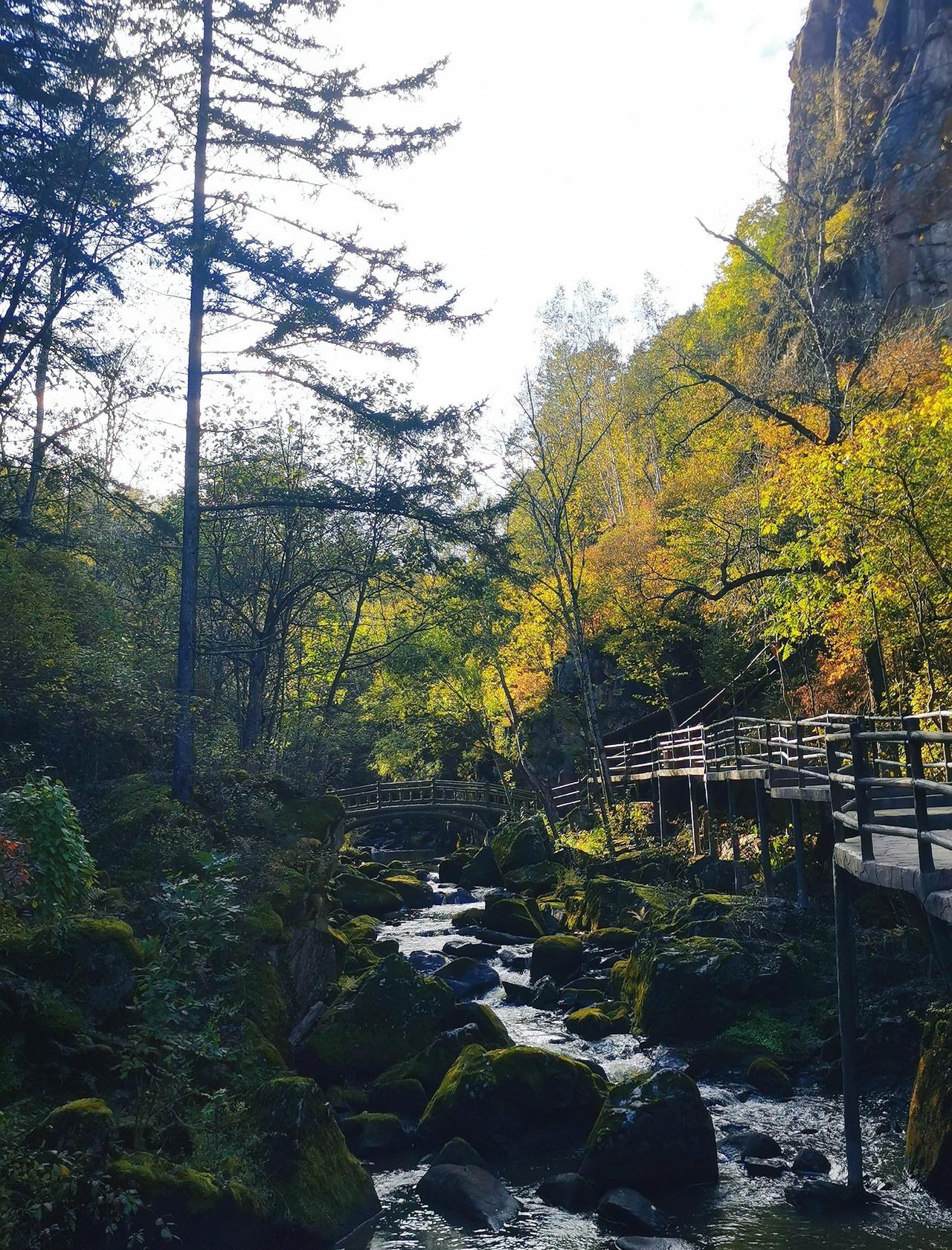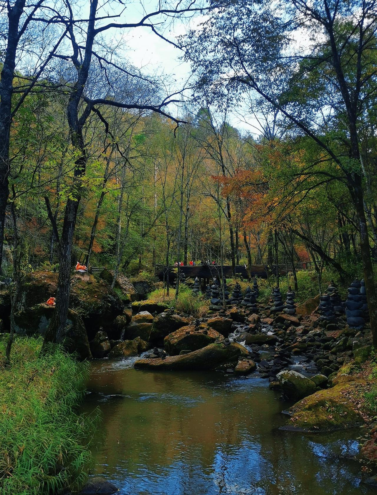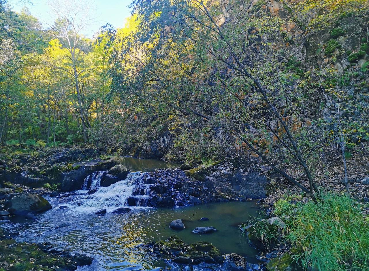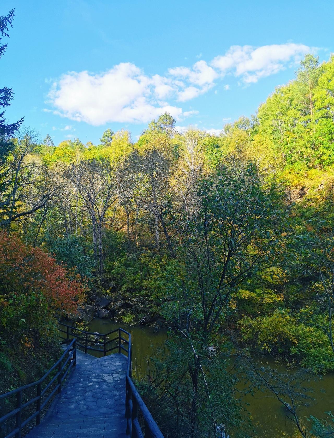 做攻略的时候,看到茅兰沟有北方小九寨之称,峡谷瀑布+翡翠湖水,灵动秀美,景观不同于其他森林公园,所以兴致勃勃的从汤旺县自驾,要来一睹美景,结果,接近景区的国道在维修,基本每50米一个坎坷的过车小道,要连续过20几个,底盘低的轿车真的伤不起[流泪] 好在,有一段路靠近界河,这里水天一色,真的漂亮,被破路创飞的心有被抚慰到一些(p1) 茅兰沟确实跟五营国家森林公园景致有些不同,水石树的组合让整体景色多了很多可看性,景区也比五营更大,但说是小九寨确实言过其实,小水泊的颜色整体比较暗黄或者青绿,并没有九寨沟那种湖蓝色,但好在天气不错,阳光透过茂密的树林洒在身上,在此间漫步,心情是自由自在;走栈道穿过一片白桦树林,空气清新,四周静谧,一切烦恼都烟消云散。 中午在一处凉亭休整,接了溪水来煮自热锅,在山林中吃着热气腾腾的米饭,简直心满意足;水足饭饱后一鼓作气,把剩下的景点一股脑逛了一遍,一路步行出了景区大门,路上途径好几个巨大的刻画少数民族生活情景的雕像,挺有记忆点。