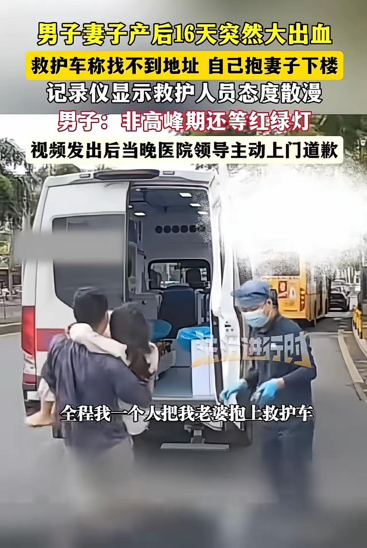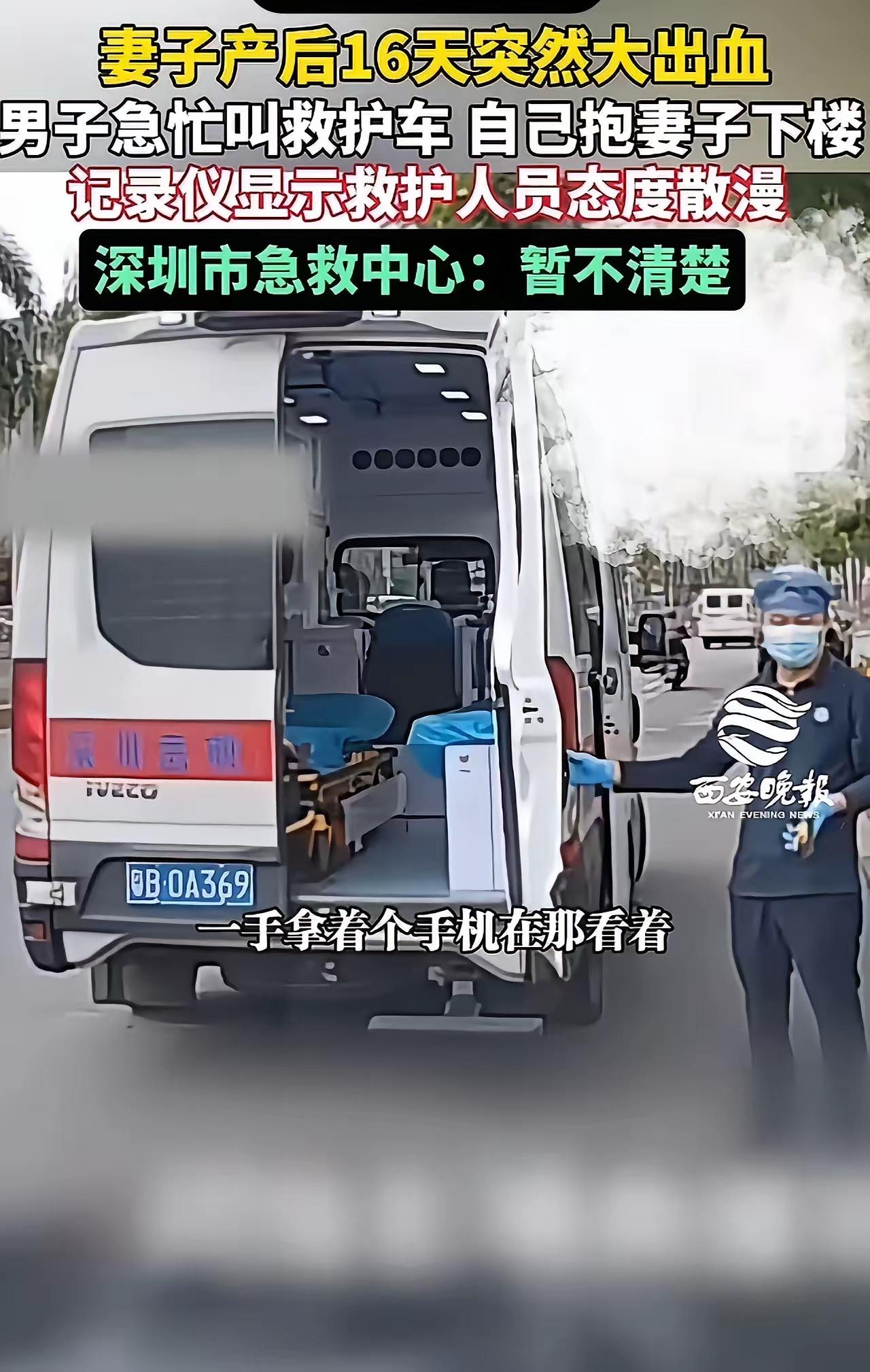 气得我血压直飙!深圳产妇大出血,救护人员竟全程当“看客”! 我刷到这事儿真要气炸了!盛先生老婆刚生完娃就大出血,床单染得通红,打120后司机居然找不到路,他只能自己咬牙把老婆从楼上抱下来,急得满头大汗冲去小区门口。 结果救护车来了,医护人员慢悠悠晃下来,看着他抱着虚弱的产妇,不光不伸手帮忙,还有人掏出手机玩!车门都没主动开,盛先生硬扛着把老婆抱上车,路上司机还慢悠悠等红绿灯——这可是要命的时刻啊! 救死扶伤是天职,找不到路、消极怠工,这哪是急救人员该有的样子?幸好医院及时道歉整改,但这种失职真的不能忍。急救车是和死神赛跑的工具,没了责任心,再快的车也救不了人!