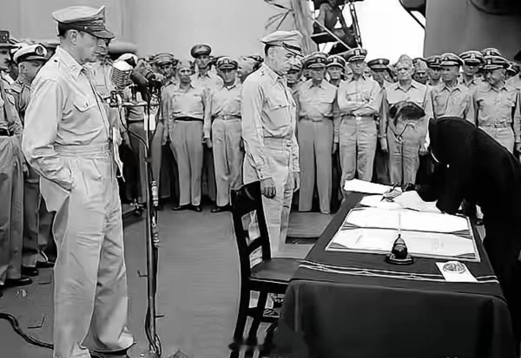 密苏里号军舰,日本投降仪式。重光葵签字时,麦克阿瑟双手插兜。至今也没见哪个日本人骂美国人态度恶劣、素质不高。