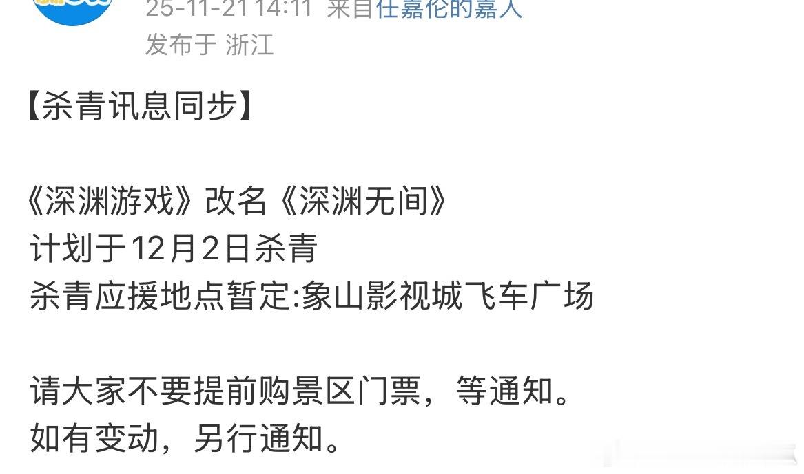 任嘉伦《深渊游戏》计划12月2日杀青,改名《深渊无间》了