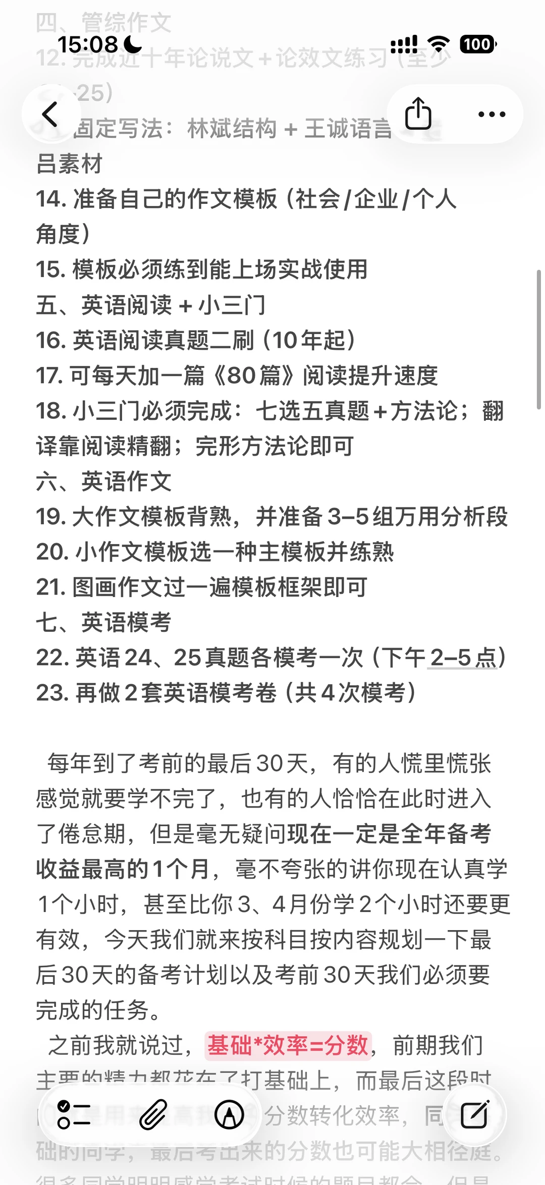 19. 大作文模板背熟,并准备3–5组万用分析段