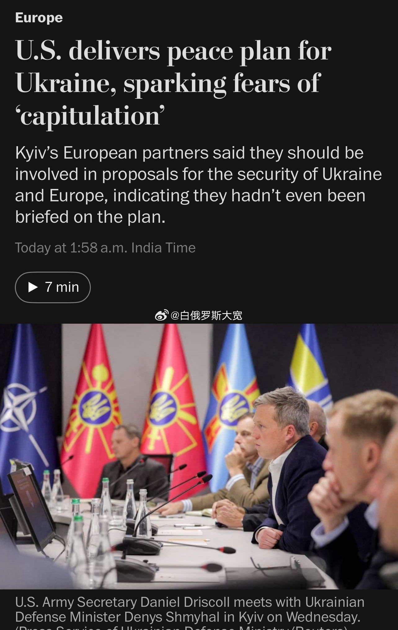 特朗普的新和平计划,首次提出美欧为乌克兰提供类似北约的集体安全保证。 一、未来俄罗斯对乌克兰发动任何“重大、蓄意并持续的武装攻击”,会被视为“威胁跨大西洋共同体和平与安全的攻击”。美国和盟友会作出回应,包括动用武力。 二、俄罗斯将摆脱西方制裁,重新加入七国集团(G7),俄罗斯收会被冻结的3000亿欧元资产中的大约三分之二的资金,剩余的1000亿欧元将用于在乌克兰开展重建项目,美国将从这些项目中获得一半利润。三、俄罗斯将获得对顿涅茨克和卢甘斯克地区的完全控制权,同时国际社会将承认俄罗斯对克里米亚的控制。赫尔松和扎波罗热地区沿接触线被冻结,这实际上意味着沿接触线的事实承认。四、北约不会在乌克兰境内驻军,乌克兰军队规模将被削减一半、被禁止拥有远程导弹。乌克兰军队人数会被限制在60万,比现在的约80万至85万更少,但比战前约25万多出许多。五、安全保障期限为十年,在双方同意下续期。六、文件列出了乌克兰、美国、欧盟、北约和俄罗斯的签字位置。白宫高级官员说,俄罗斯方面已获知这份草案,但普京是否最终需要签字仍不清楚。