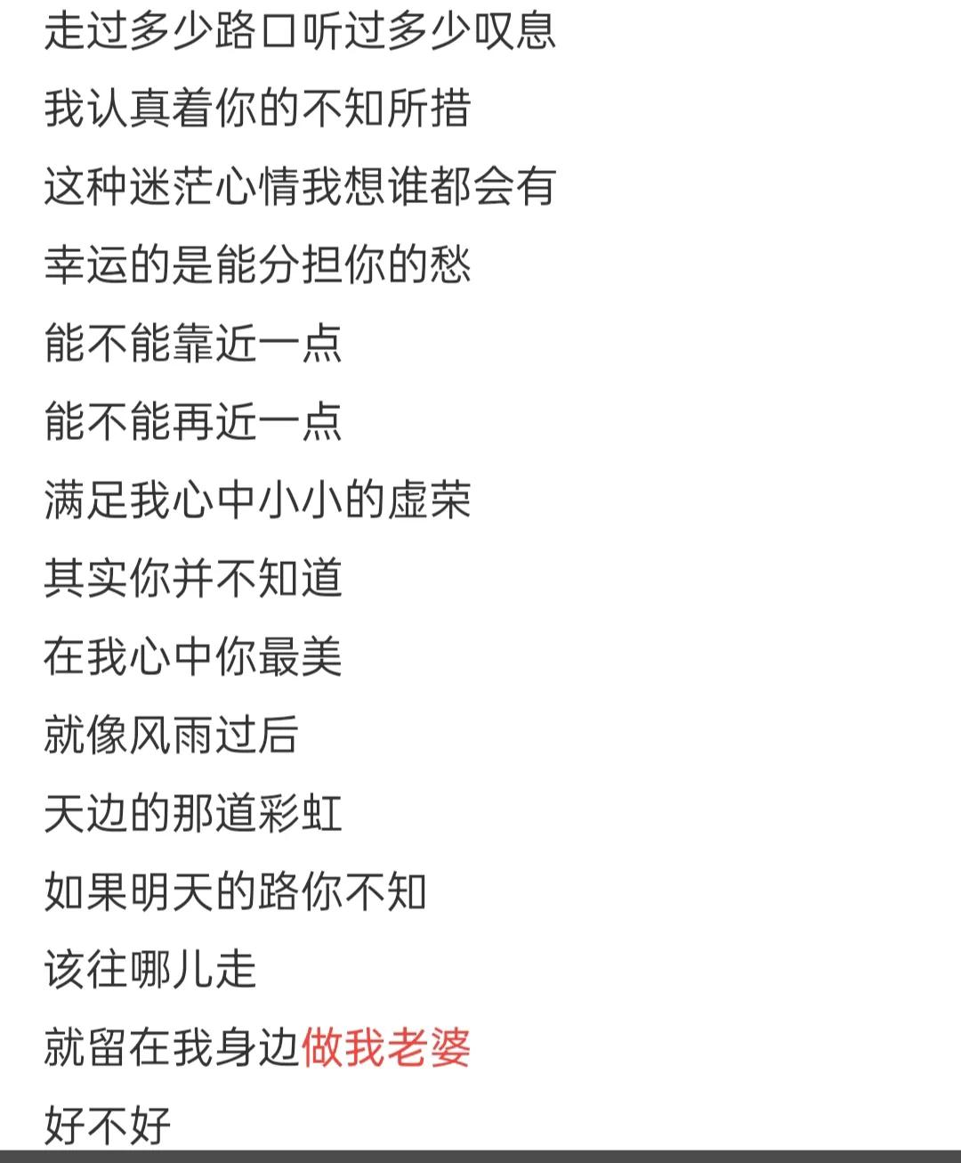有句俗话 : 赶的早不如赶的巧,今天是光棍节,配上这首歌曲恰到好处,好听的歌曲马上安排。 《做我老婆好不好》 有个朋友喜欢唱歌,然后我就给发了一个视频链接,链接都是歌曲,转发置顶第一首歌曲,想也没想,看也没看,我一点就给转发出去了。 结果对方回复信息说今天是光棍节?让我听这首歌曲吗[捂脸],当时我脑袋有点懵,这回复信息有点奇怪,我反应一下,我打开链接的歌曲,一看歌曲的名字是《做我老婆好不好》,哎呀,这就是少看一眼的后果。 然后我查一下今天到底什么日子?哦,原来今天正是光棍节!